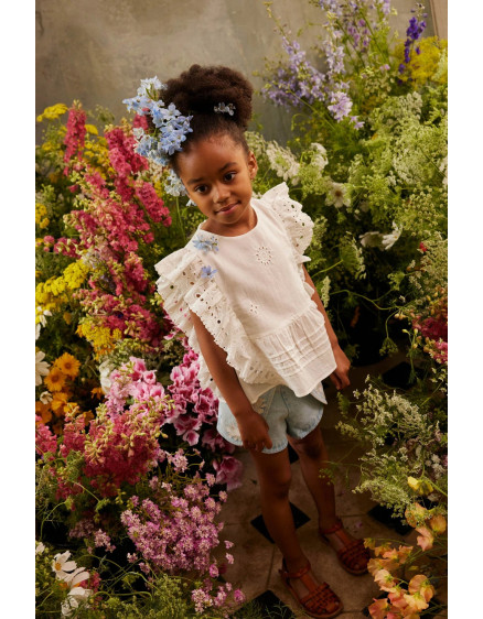 This charming white blouse features delicate eyelet details and playful ruffles that twirl with every move. Crafted from 100% organic cotton with beautiful schiffli embroidery, it's soft against skin and kind to the planet. Perfect for pairing with the Asya Shorts for an effortlessly sweet look that lets her personality shine through.