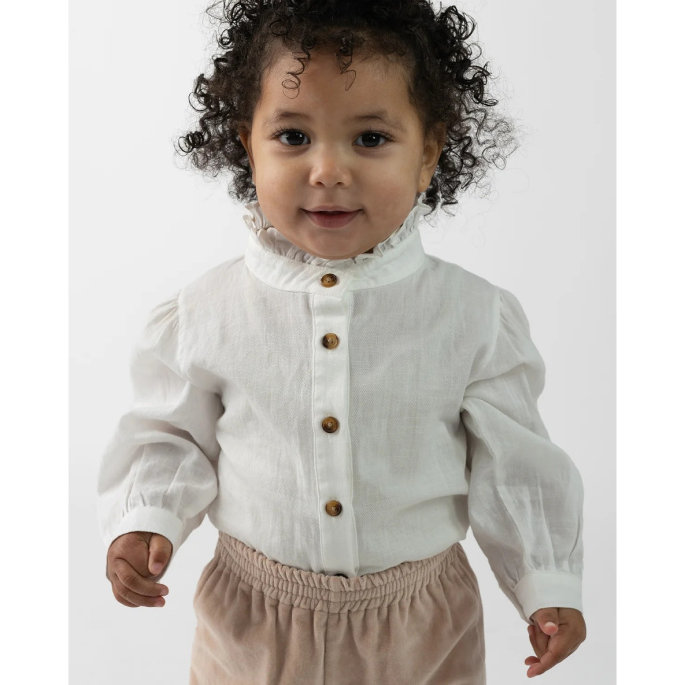 Pretty as a snowdrop! Add a touch of elegance to your little one's outfit with the beautiful Fini blouse. Thanks to an adorable ruffled collar, poofy sleeves and a button fastening through the front, this blouse breathes style and perfectly combines with any item from your little one's wardrobe. Made from 100% cotton.