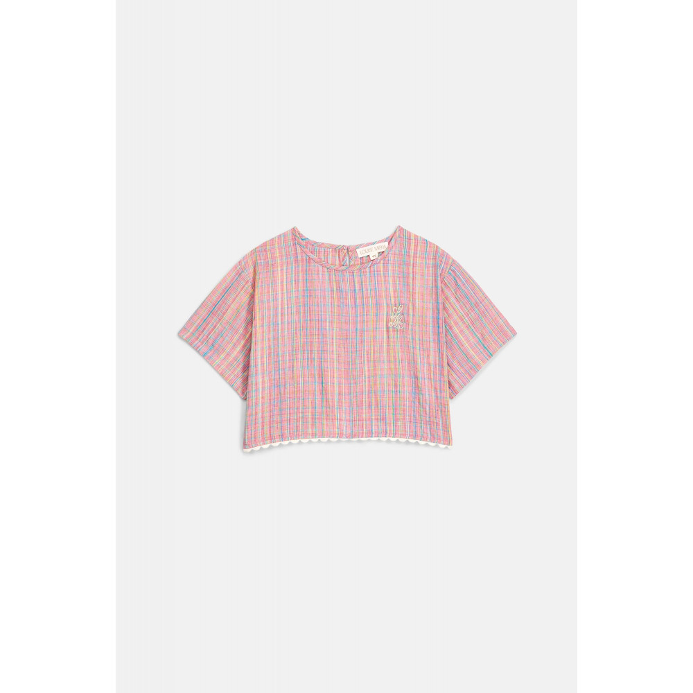 Striped cotton and linen top. Small "Louise Misha" embroidery on the front. Slim fit. Button closure at back. Crossover back panels revealing the lower back, with ruffle trim. Ruffle trim at the hem.
