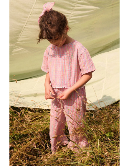 Striped cotton and linen top. Small "Louise Misha" embroidery on the front. Slim fit. Button closure at back. Crossover back panels revealing the lower back, with ruffle trim. Ruffle trim at the hem.