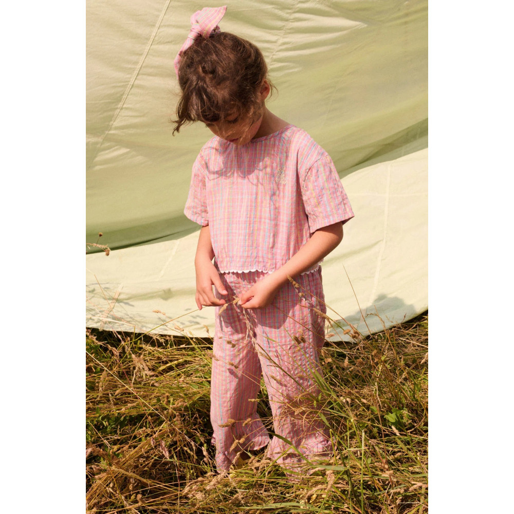 Striped cotton and linen top. Small "Louise Misha" embroidery on the front. Slim fit. Button closure at back. Crossover back panels revealing the lower back, with ruffle trim. Ruffle trim at the hem.