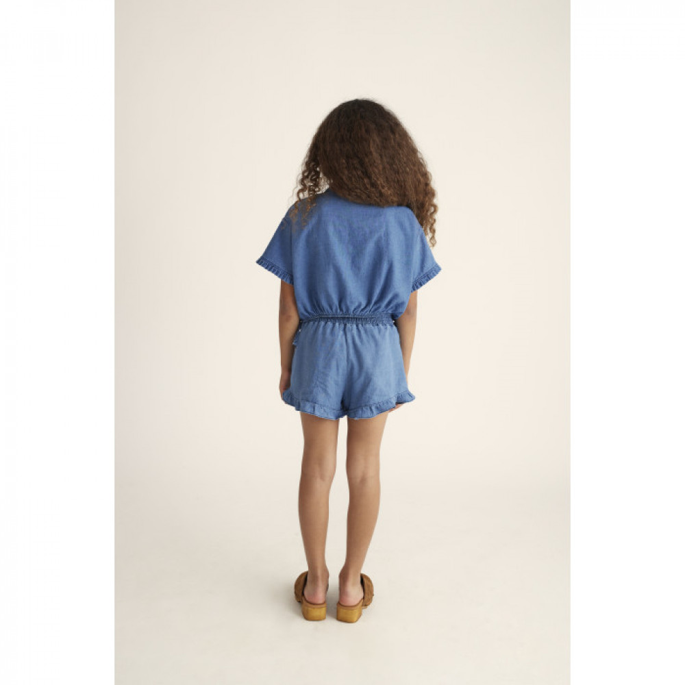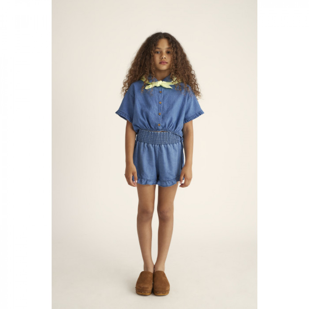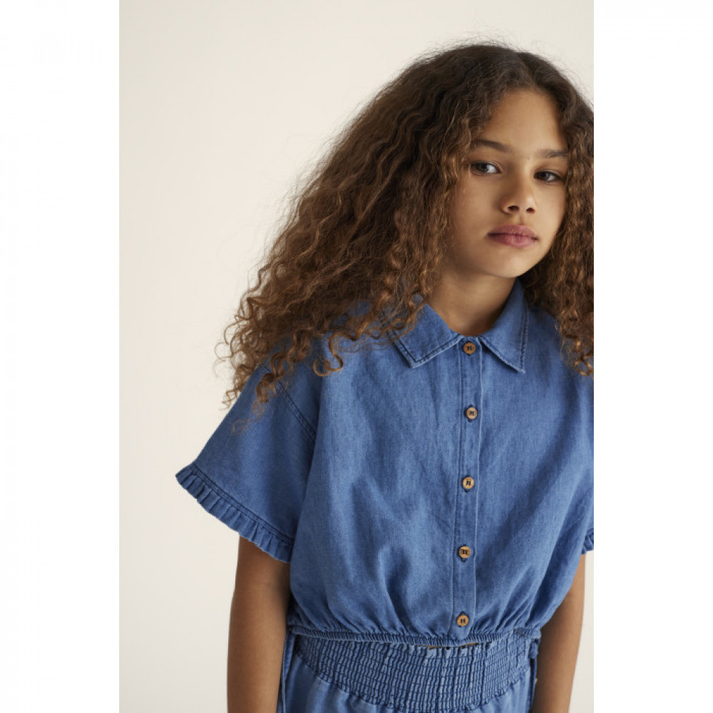 Denim top for girls in soft twill cotton. Shirt collar. Button placket at the front. Dropped shoulders. Short sleeves with ruffle trim at cuffs. Rounded hemline with drawstrings at the sides. Washed denim effect.