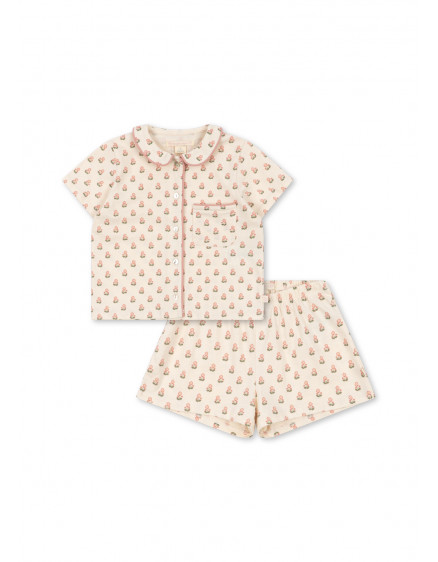 Soft two-piece set featuring a short-sleeved blouse and shorts with a comfy elastic waistband. The blouse is designed with full button opening in front and a decorative round collar. Made of 100% organic cotton.