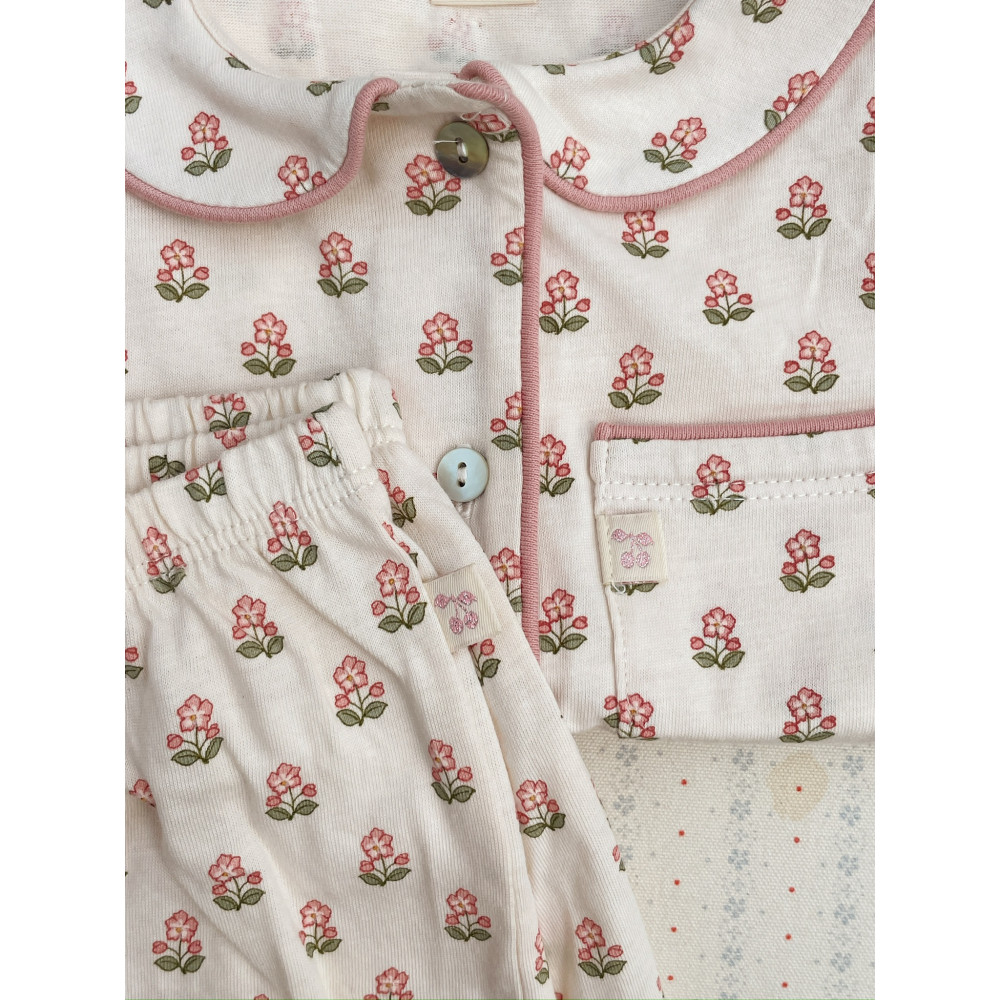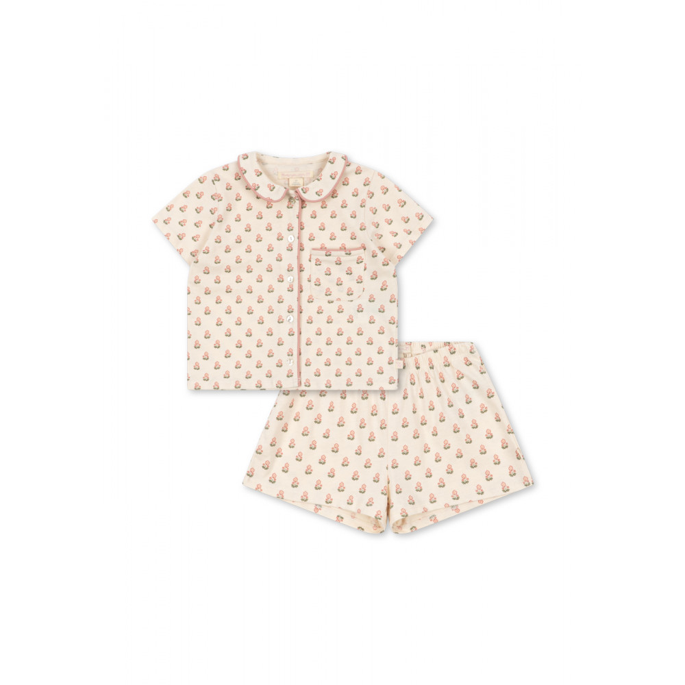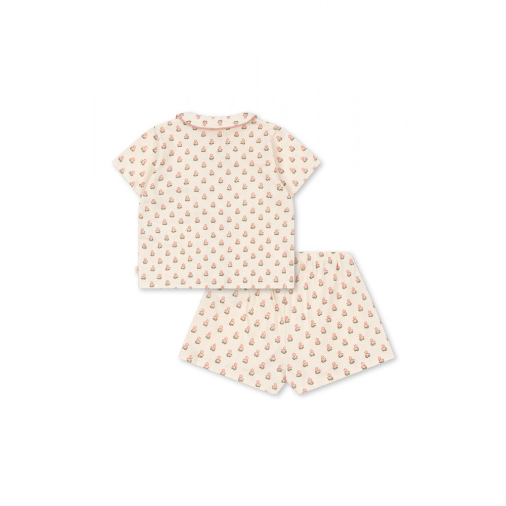 Soft two-piece set featuring a short-sleeved blouse and shorts with a comfy elastic waistband. The blouse is designed with full button opening in front and a decorative round collar. Made of 100% organic cotton.