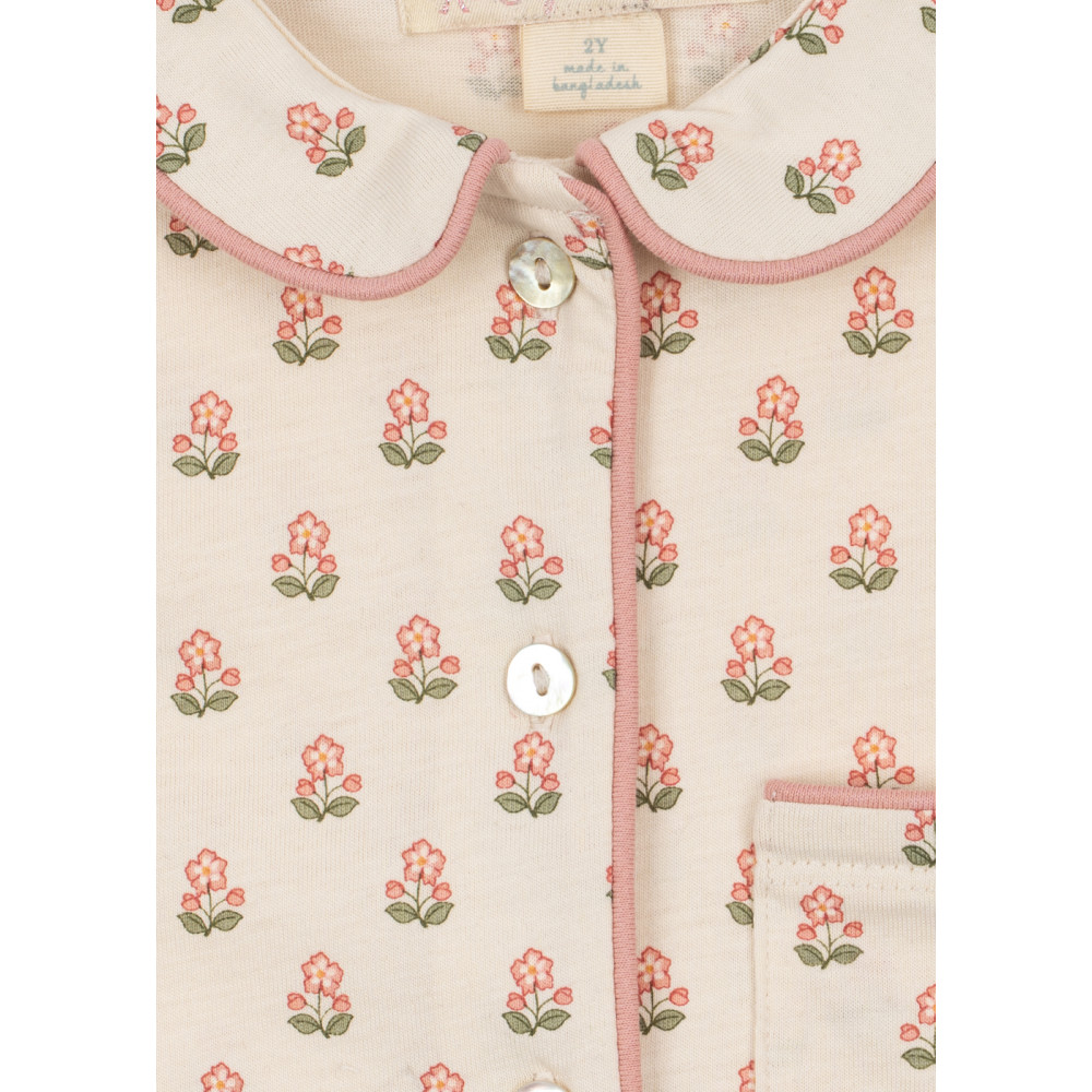 Soft two-piece set featuring a short-sleeved blouse and shorts with a comfy elastic waistband. The blouse is designed with full button opening in front and a decorative round collar. Made of 100% organic cotton.
