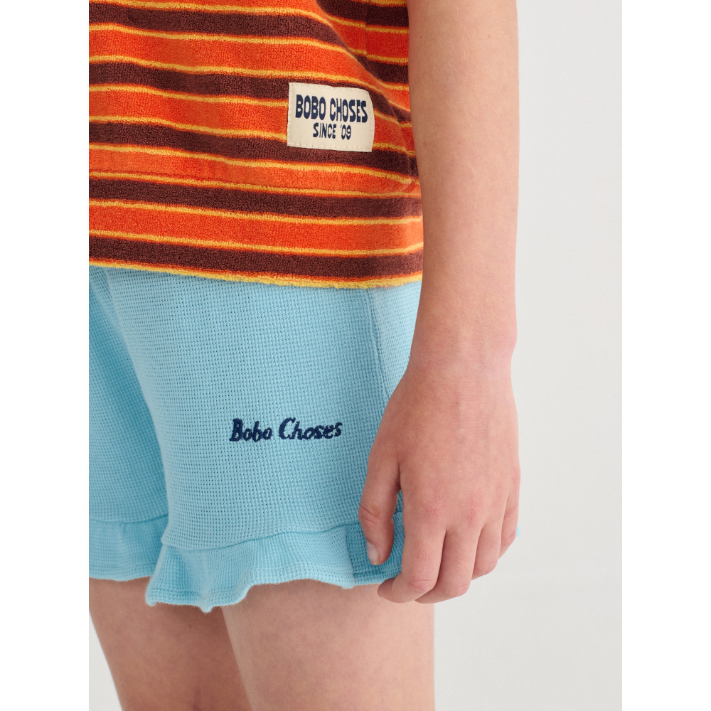 Light blue shorts. Designed with elasticated waistband, embroidery, short, relaxed fit and ruffled detailing