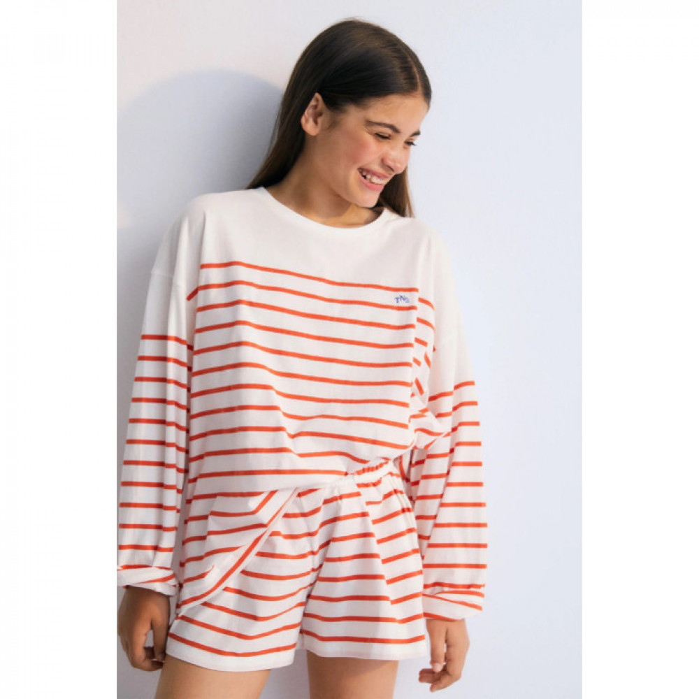 Bicolor striped shorts with an elastic waistband for maximum comfort. Designed for a relaxed fit, they can be paired with the matching T-shirt to create a complete, nautical-inspired look.