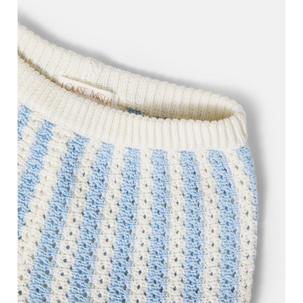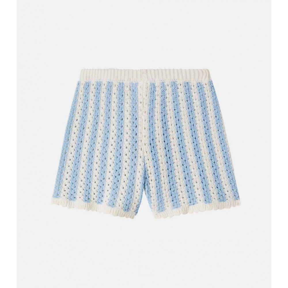 The Mekylane shorts are crocheted from cotton and feature a blue and white striped motif, scalloped trims, and an elasticated waistband.