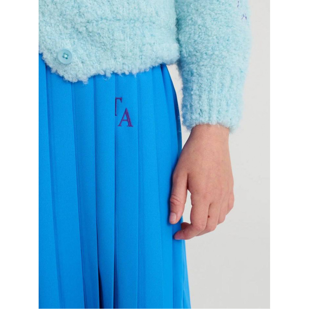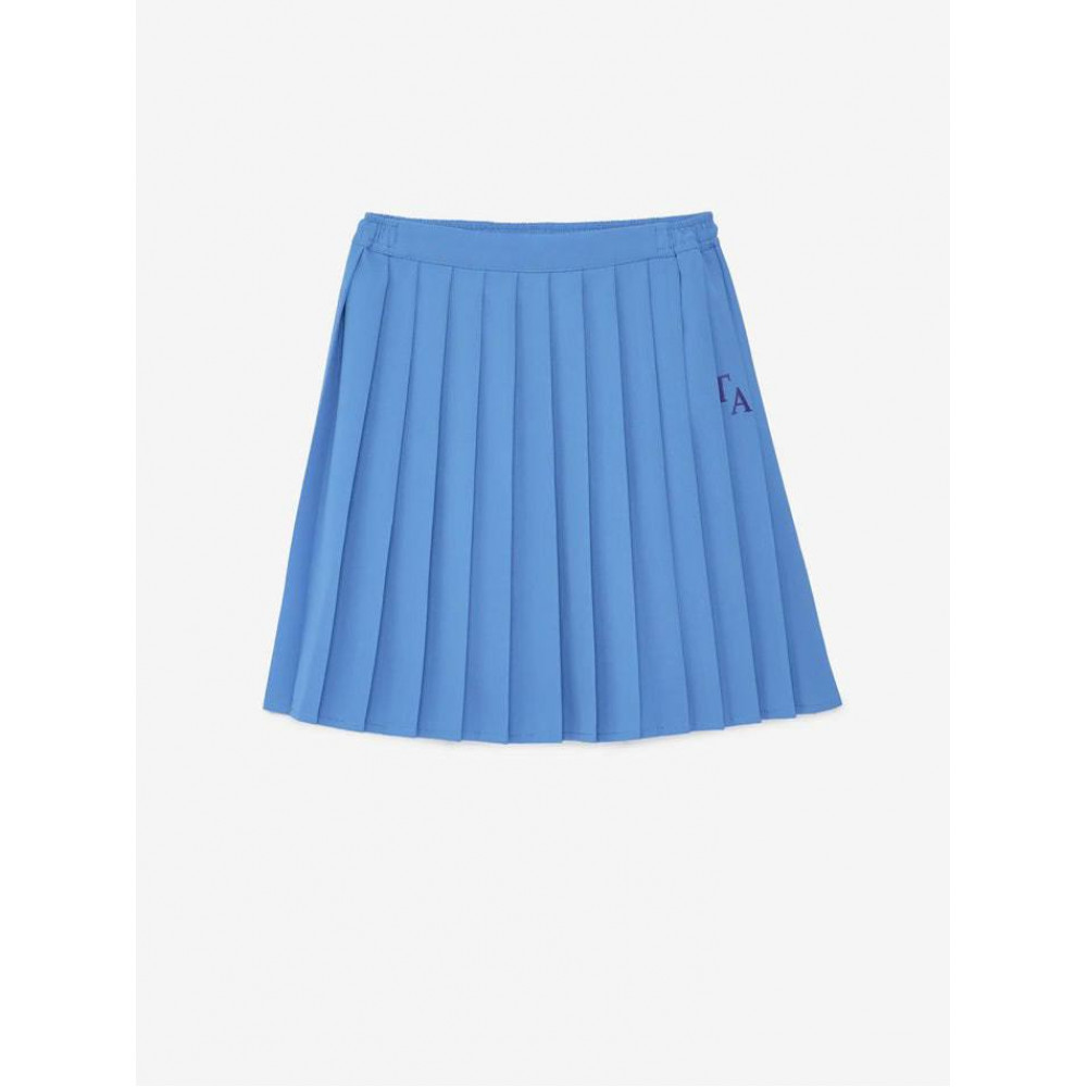 Aerosol Skirt is made of 100% polyester. This vibrant skirt features a classic pleated design in a cheerful bright blue hue. It has a comfortable elasticated waistband for an easy fit. A "TA" embroidery in purple is placed on the left side, adding a signature detail. It has an evasé fit.