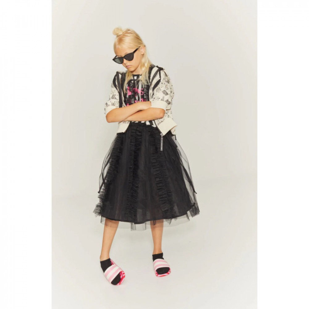 Strikes a balance between boldness and delicacy. Airy skirt with vertical ruching detail. Black elastic waistband.