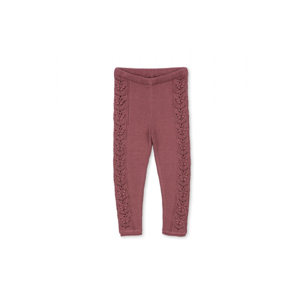 Soft cardigan designed with a roll edge neckline and frill details. Finished in a delicate knitting pattern with mother of pearl buttons in front. Knitted pants in a soft cotton quality. Designed with an intricate knit pattern along the legs, a straight fit, and a comfy elastic waist.