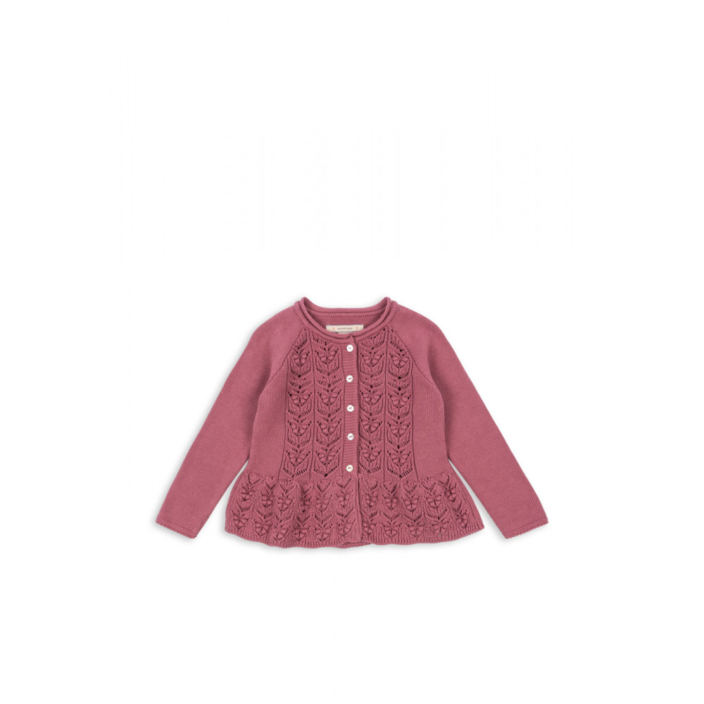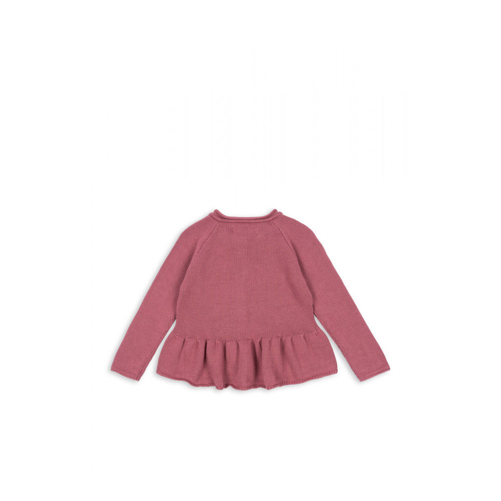 Soft cardigan designed with a roll edge neckline and frill details. Finished in a delicate knitting pattern with mother of pearl buttons in front. Knitted pants in a soft cotton quality. Designed with an intricate knit pattern along the legs, a straight fit, and a comfy elastic waist.