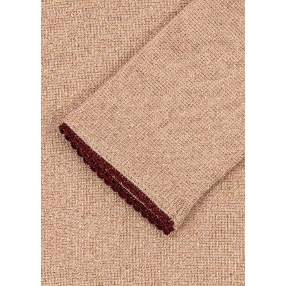 Soft and stretchy rib blouse. A perfect everyday piece woven with a lurex thread for a little bit of shine. Designed with decorative picot edges around the neck line. Soft and stretchy leggings with a shiny finish. Features an elastic waist and a straight, slim fit.