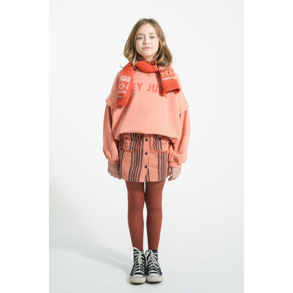 Sweatshirt with frontal and back prints. Detailed with ruffles on the sleeves. Carded organic cotton fleece. Ribbed cufs. Baby sizes have buttons on the shoulders. Made in Portugal