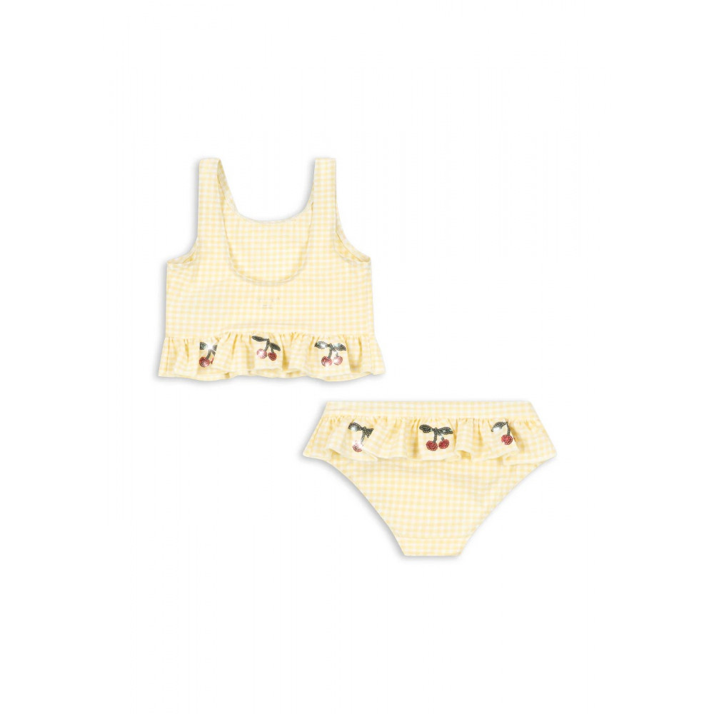 Bikini in a textured seersucker fabric with frills and cherry sequin details. Crafted in a quick-drying and flexible fabric that is perfect for long days by the beach or pool. Press buttons at leg opening from size 6M -18M
