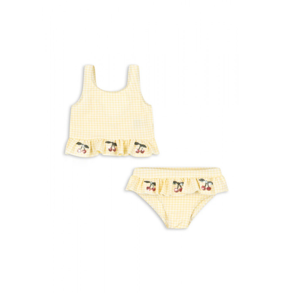 Bikini in a textured seersucker fabric with frills and cherry sequin details. Crafted in a quick-drying and flexible fabric that is perfect for long days by the beach or pool. Press buttons at leg opening from size 6M -18M