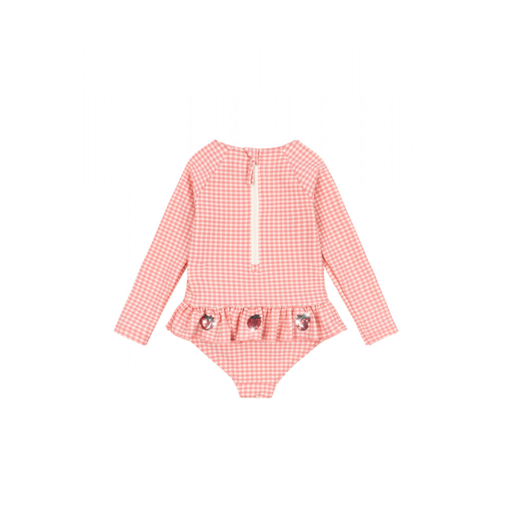 Swimsuit in a textured seersucker fabric with frills and cherry sequin details. Designed with long sleeves for extra protection against harsh UV rays, and crafted in a quick-drying and flexible fabric that is perfect for long days by the beach or pool. Press buttons at leg opening from size 6M -18M
