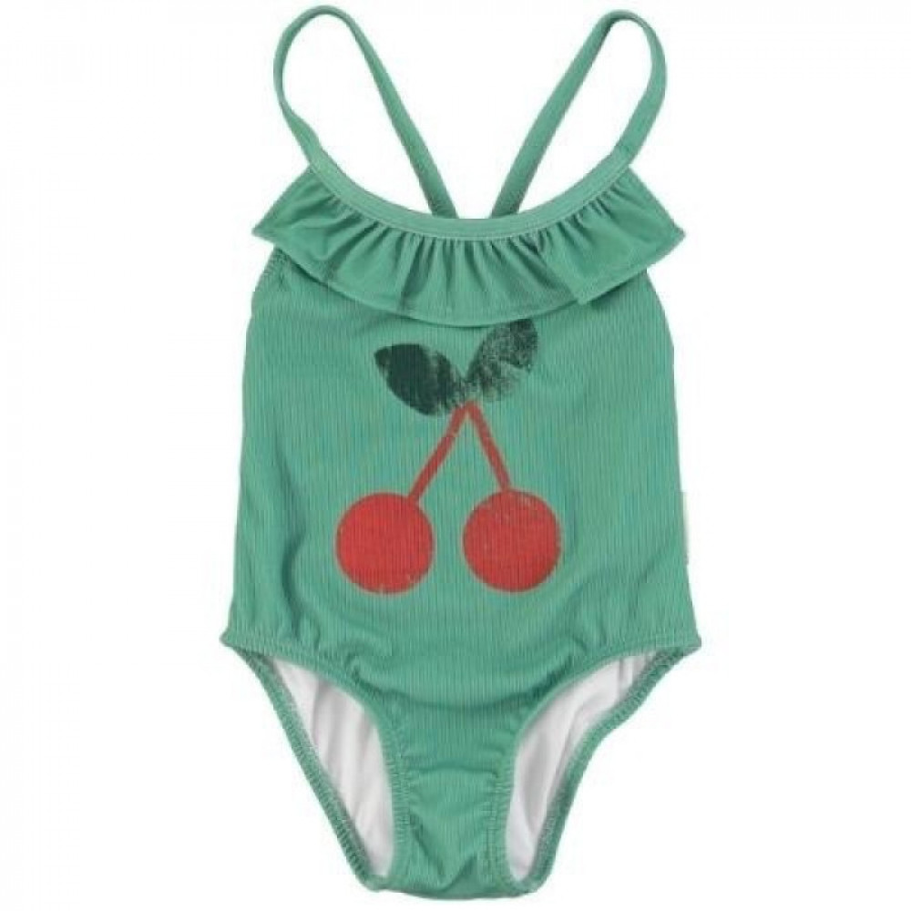 Swimsuit with thin straps. Ruffle on chest and front print. Crossed thin straps on the back. Detailed with red star logo on the back.