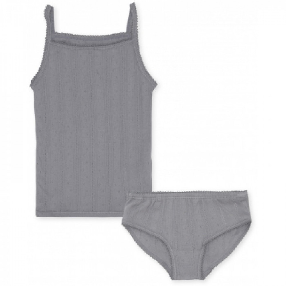 Soft 2-piece set made in 100 percent organic pointelle cotton. Designed with picot edges and elasticated straps and waistline.
