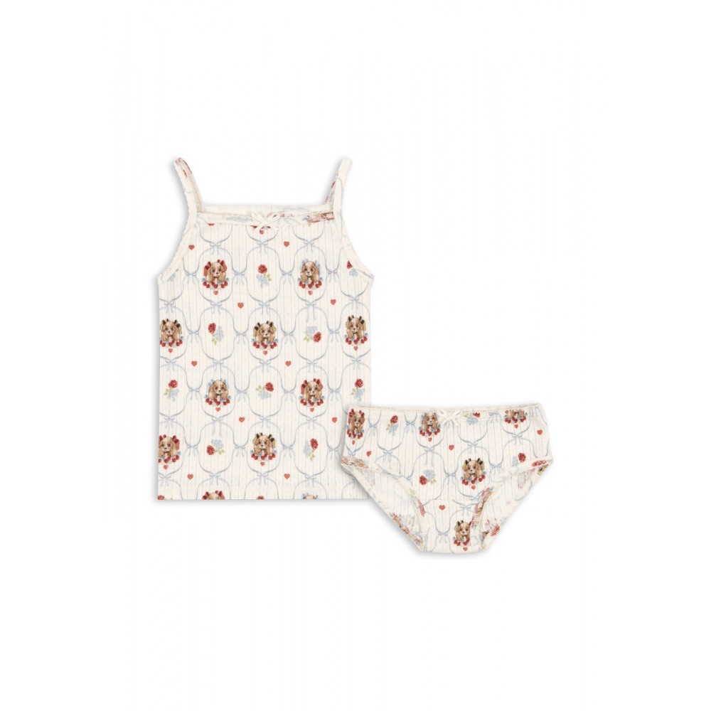 Soft two-piece underwear set with a strap top and underpants made from 100% organic cotton. Minnie is our classic line of basic essentials crafted from soft organic cotton. These essentials are made to be worn both day and night as a comfortable layer close to the skin, and is designed with a decorative all-over pointelle pattern and picot edges.
