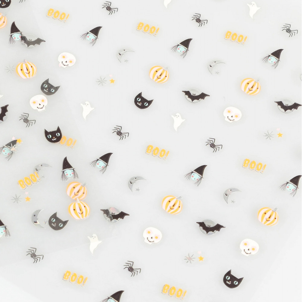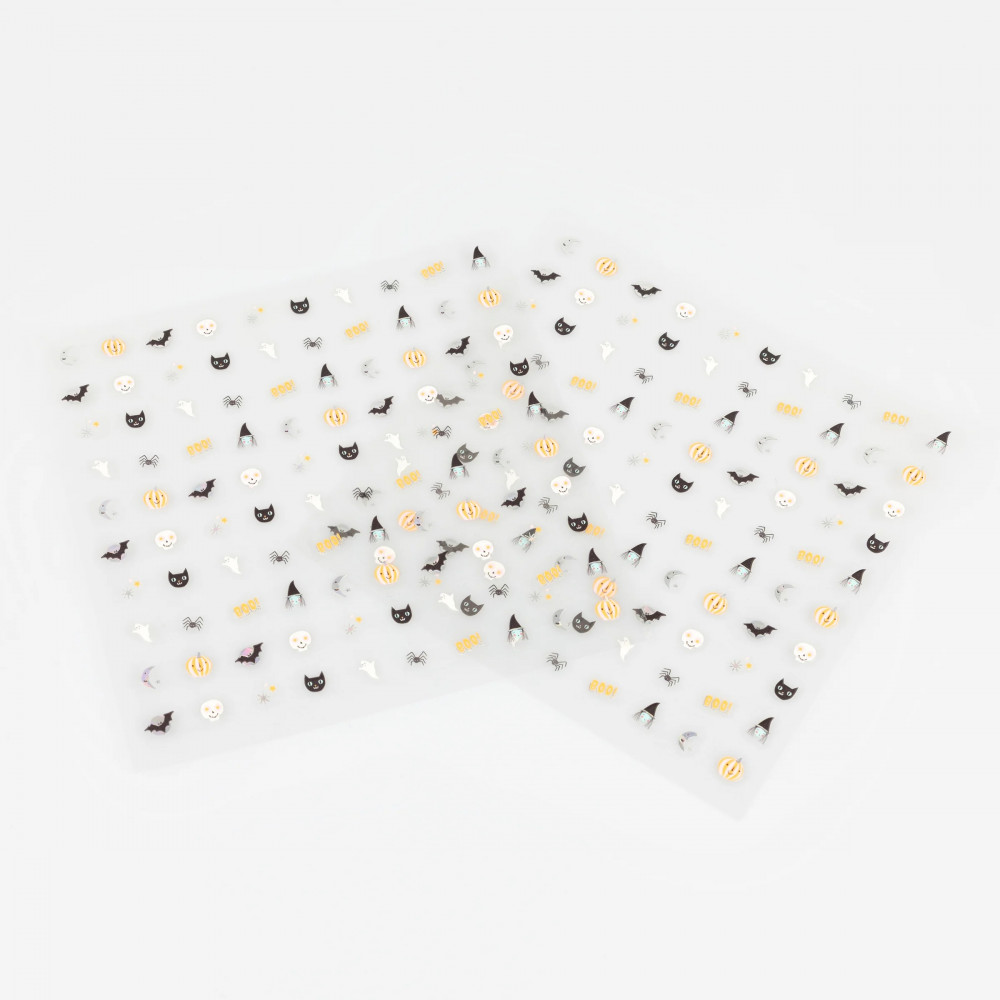 Ditch the usual candy and treat kids to a Halloween accessory with serious flair instead! Simply apply these chic nail stickers for enchanting effects in seconds. Presented in fun striped pumpkin packaging, this set features iconic Halloween motifs in classic shades and shiny silver holographic foil for a spellbinding shimmer. The perfect gift for a fashion-forward Halloween lover, as a party activity, or they make a great addition to Halloween party bags. The pack includes 200 nail stickers 10 designs of black cats, spiders, witches, bats, skulls, pumpkins, stars, moons, ghosts and the word Boo! Shiny silver holographic foil Pink and orange striped pumpkin packaging, making this set a brilliant gift Instruction sheet Suitable for ages 3+ Pack of 200 in 10 designs Pack dimensions: 8.125 x 7.25 x 0.125 inches