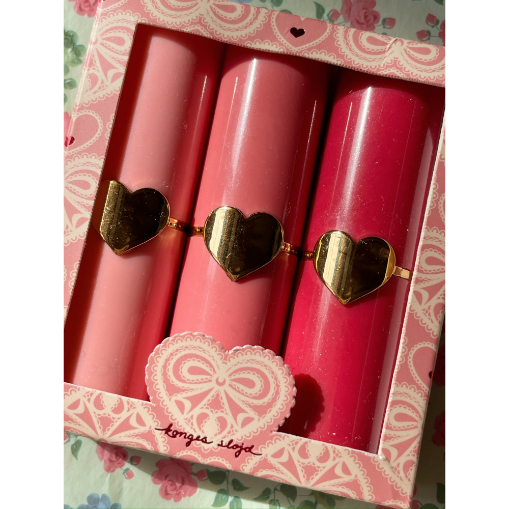Pucker up with Konges Sløjd lip balms. Our lip balms both nourish and protect children's lips, and each lip balm features a unique child-friendly scent that is carefully selected to ensure a fun experience. Try every version and pick your favorite one! The set is delivered in a beautiful box that is ideal as a sweet gift. Made specifically to be used on delicate children's skin, our lip balm set is gently formulated and completely safe for children to use. The product has been diligently tested for harmful substances, and all ingredients are approved for contact with the skin. CE approved and vegan. Suitable from 3y+