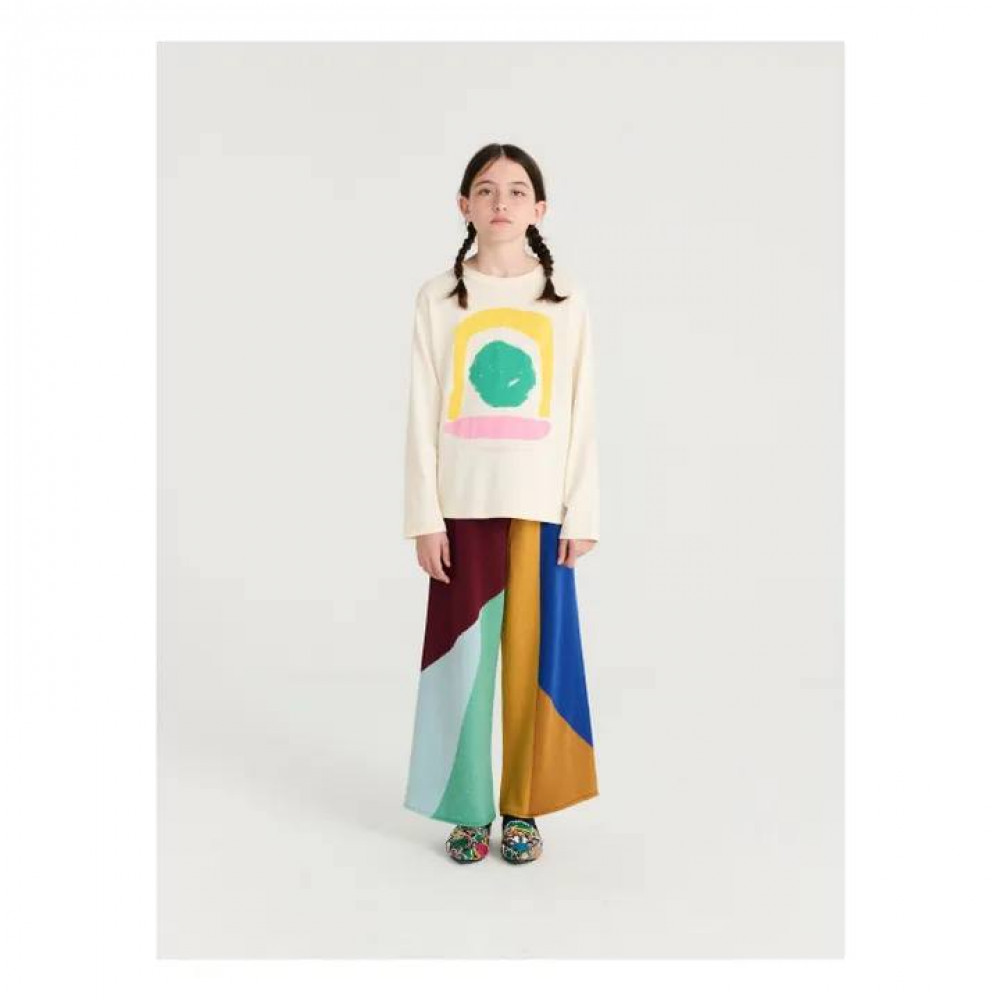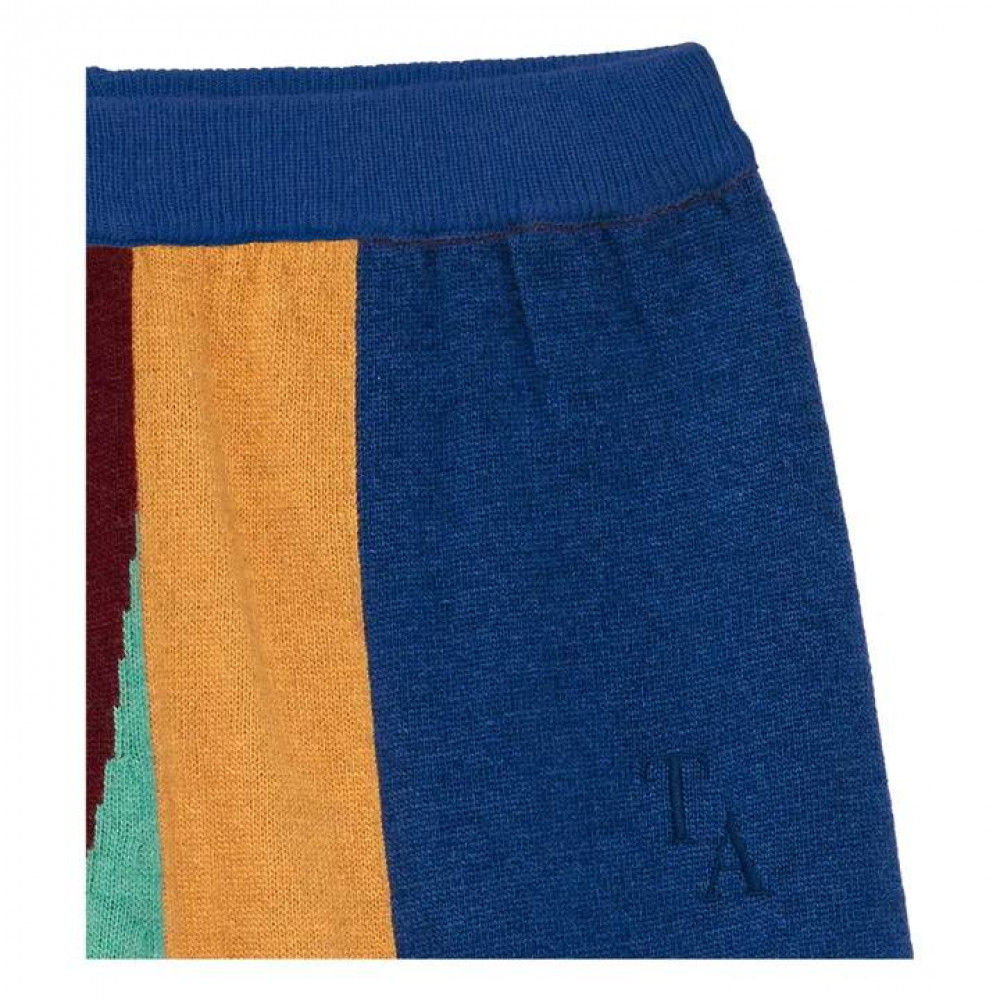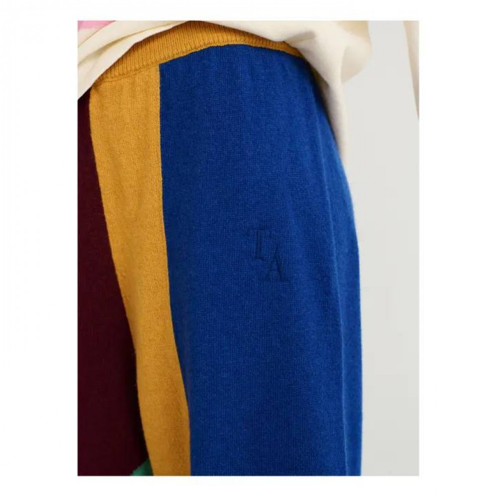 Aerosol Knitted Pants are made of 30% wool, 30% viscose, 35% recycled polyamide and 5% cashmere. These vibrant knitted trousers feature a bold abstract color-block design in a rich colorful palette. They have a subtle "TA" embroidery and are designed with a comfortable elasticated waistband in a contrasting blue, and a relaxed, wide-leg fit. Made in Spain.