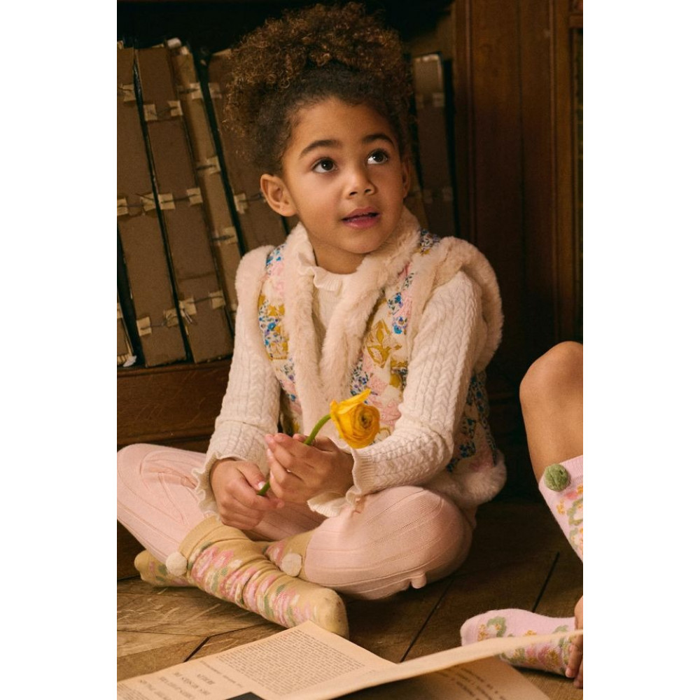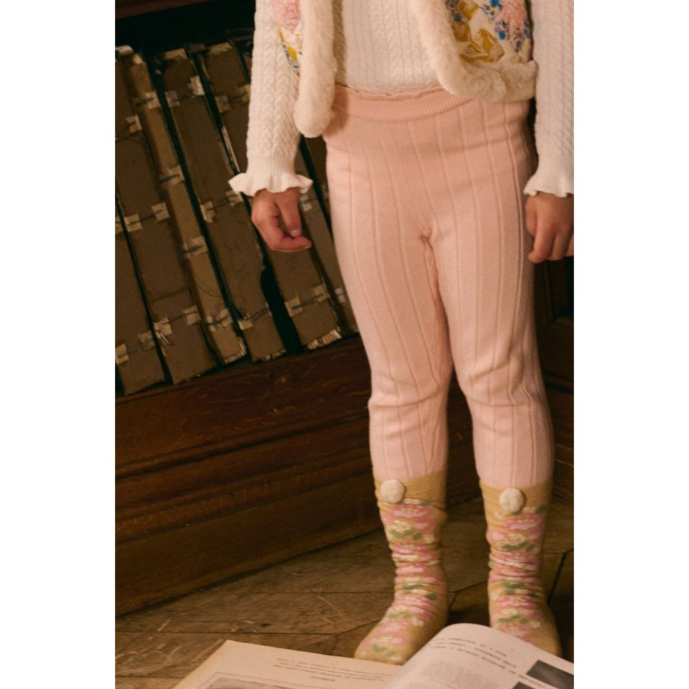 Rib knitt leggings. Elasticized, ruffed waist. Pompom detailed at the ankles.
