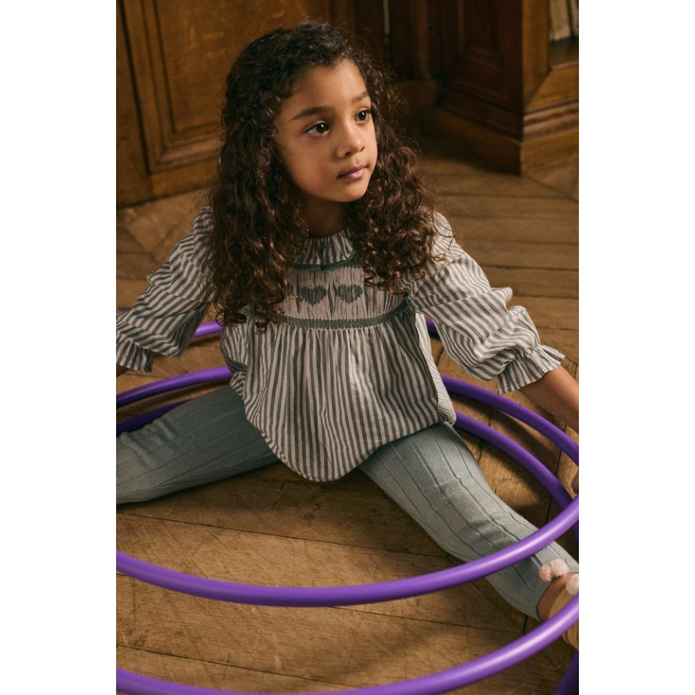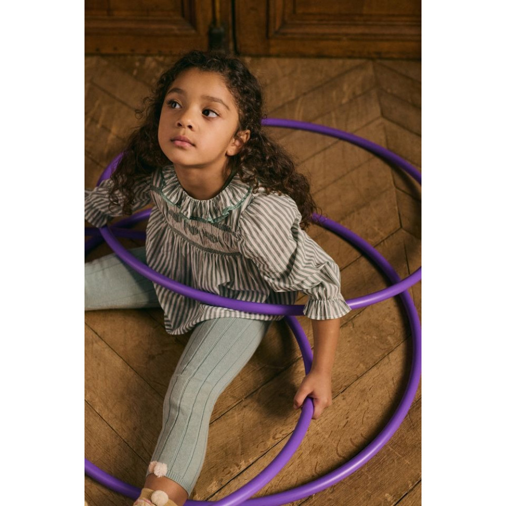 Rib knitt leggings. Elasticized, ruffed waist. Pompom detailed at the ankles.