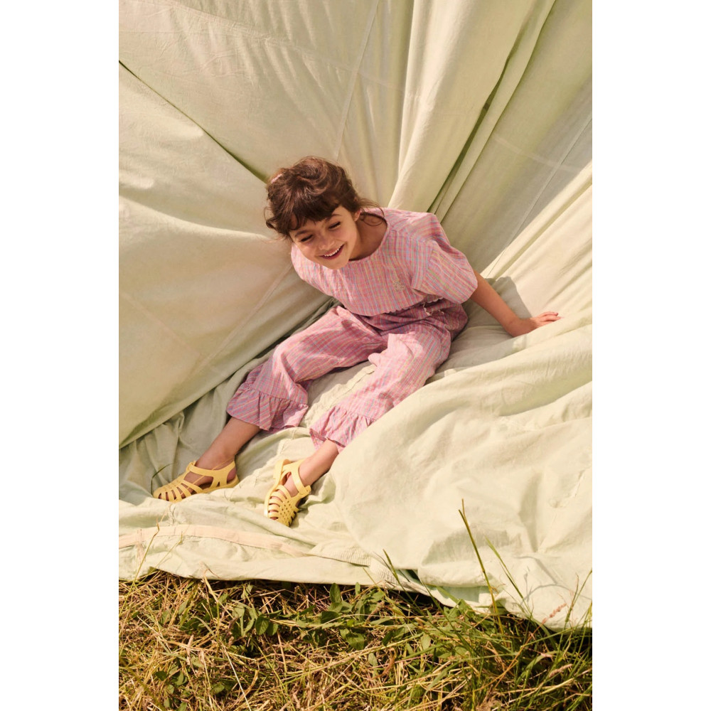 Striped cotton and linen pants. Elasticized waist at the back. Side pockets with rickrack finishes. Straight legs with ruffles at the bottom.