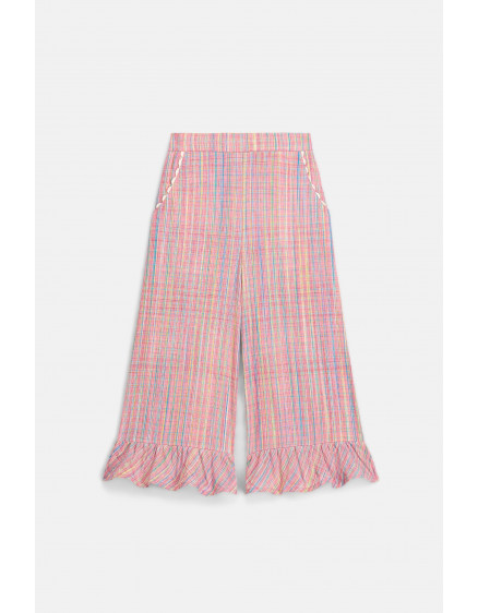 Striped cotton and linen pants. Elasticized waist at the back. Side pockets with rickrack finishes. Straight legs with ruffles at the bottom.