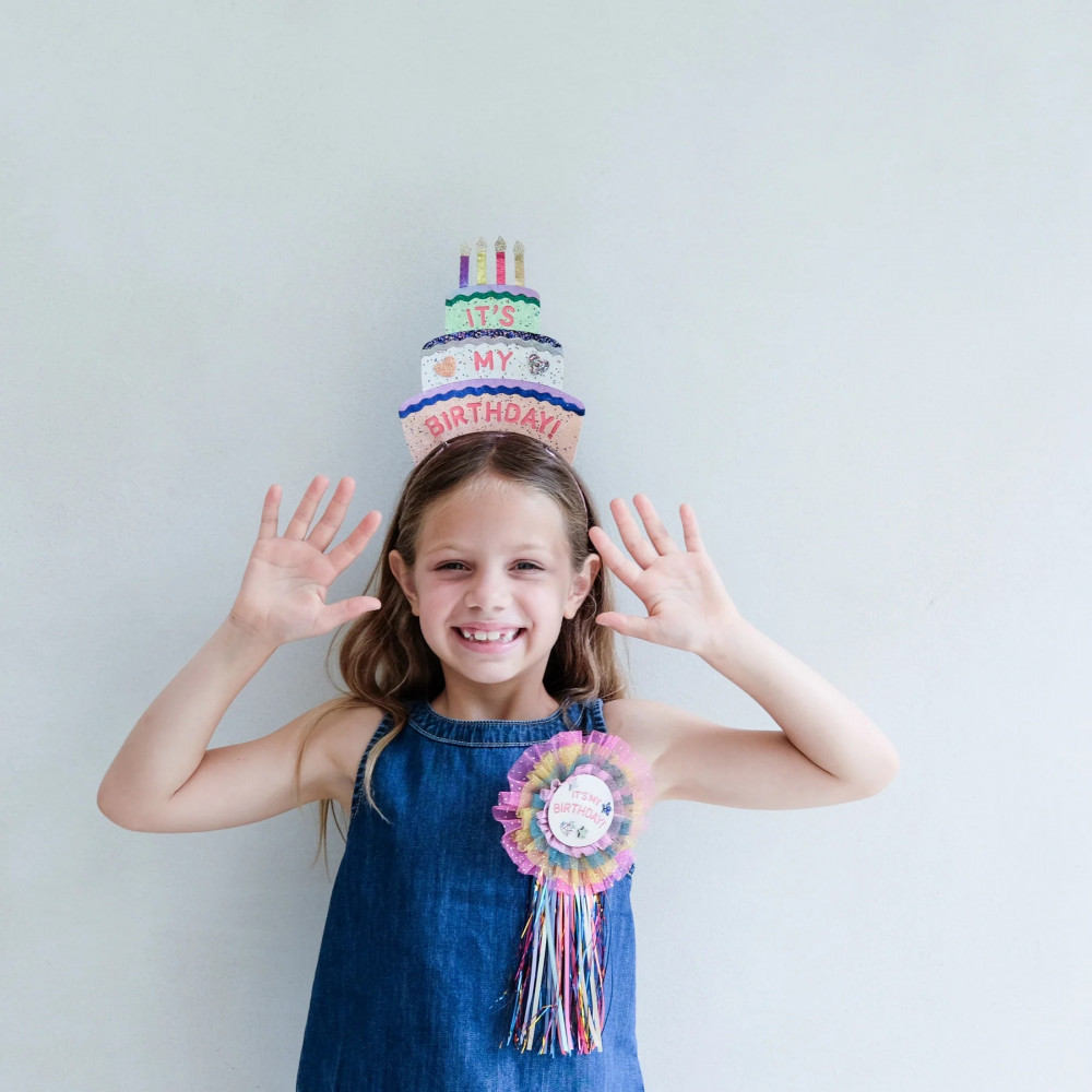 Hip hip hooray! Make sure they know it's your birthday today with this super sparkly, statement headdress that will guarantee all eyes are on the Birthday Girl! Soft pink satin wrapped alice band to fit ages 3-10 years Three 'tiers' of birthday cake crafted from fine glitter fabrics and embellished with glitter hearts and 'It's my birthday' wording in pink, all adorned with four brightly coloured metallic candles with gold glitter 'flames' Warning! Not suitable for children under 36 months