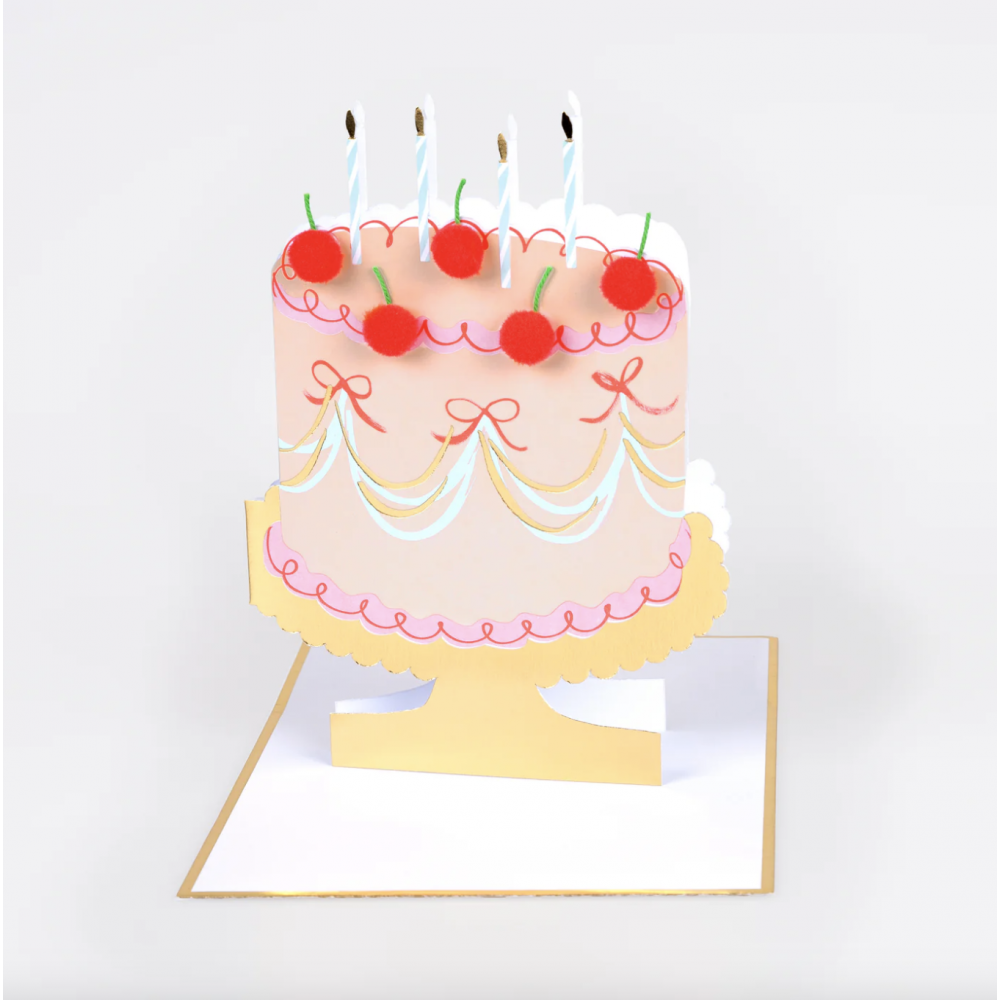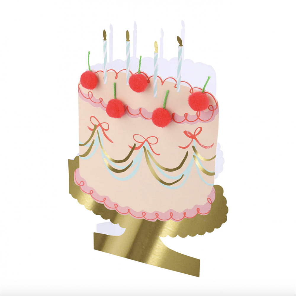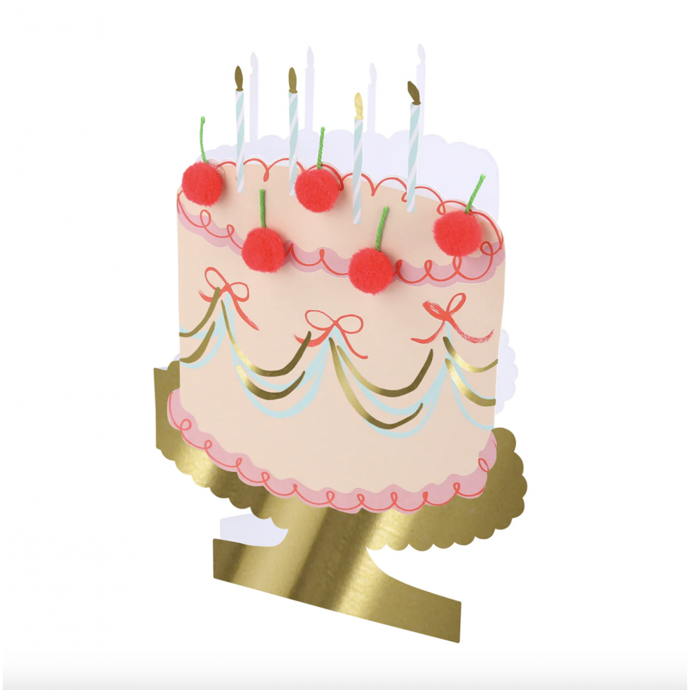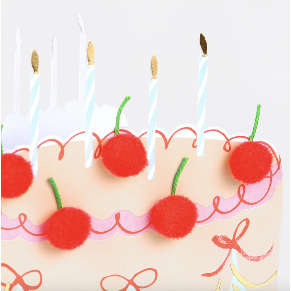 Highly decorated cakes are having a moment, so this special card is the sweetest way to send birthday wishes to a loved one. The cherry pompom embellishments will make this charming design stand out on the mantel or party table. Red pompom cherries with green cord stalks Shiny gold foil details on the card base and the envelope Inside Message: Happy Birthday. 127 x 178 x 6mm