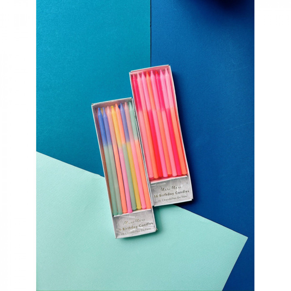 These charming candles will add a fabulous splash of colour to any celebration cake or cupcakes. The candles feature different colour combinations, which will complement any party theme you choose. The 16 candles feature a mix of mint, blue, pink, pale pink, neon coral and yellow Pack of 16 in 8 colours Product dimensions: Candle height - 146mm