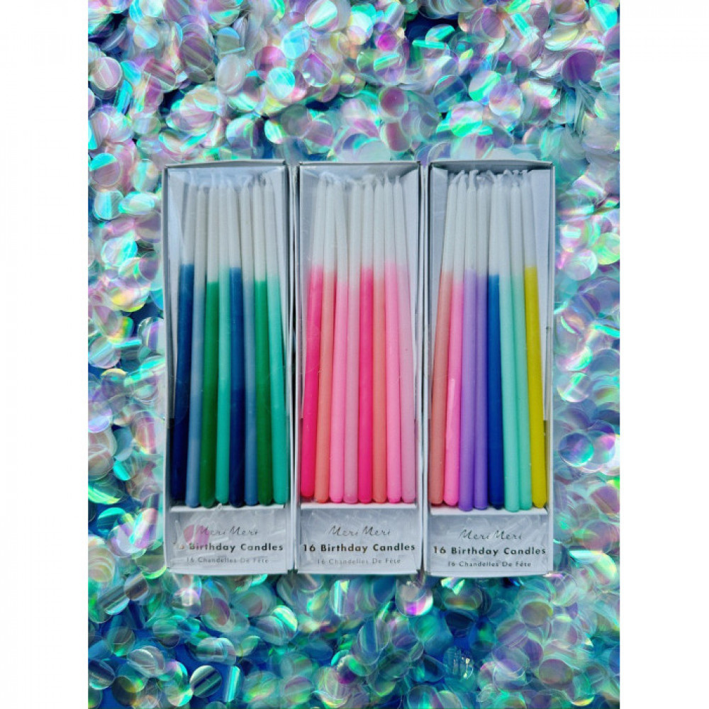 Make a celebratory cake, or cupcakes, look amazing with these beautiful blue candles. Perfect for a birthday or baby shower. Elegantly dipped create sixteen candles in four shades of blue. Pack of 16 in 4 colors Candle height - 6.75 inches