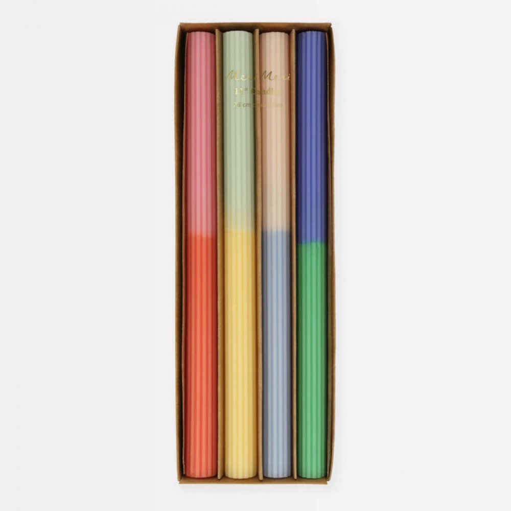 Why have white candles when you can have fun, colorful creations? This set of four candles will instantly add a pop of color to your party table or mantel. A fabulous gift. Two colors of wax per candle. Colors are pink and red, mint and yellow, peach and light blue, dark blue and green Colored wicks, which match the top color of each candle Burn time is 7 hours Packaged in a kraft box Fragrance free Pack of 4 in 4 colors Product dimensions: Candle height - 11 inches