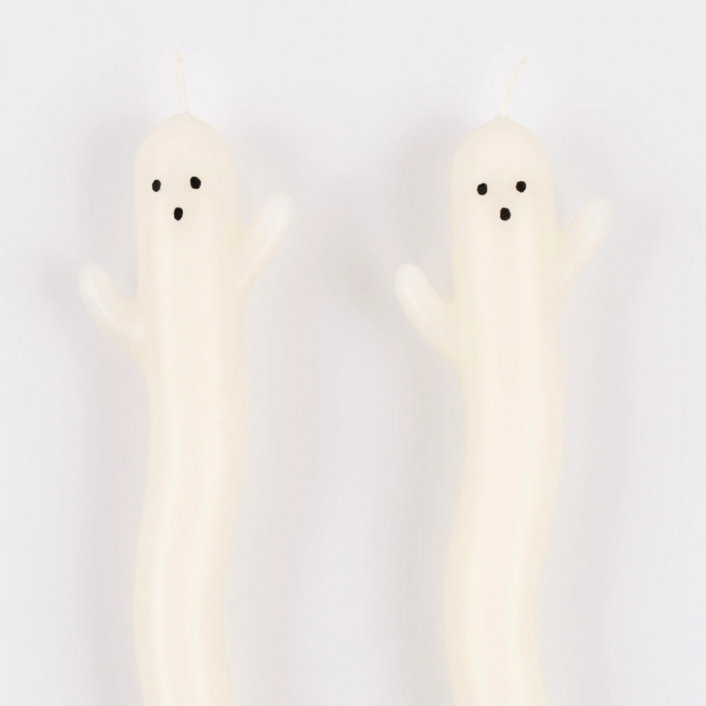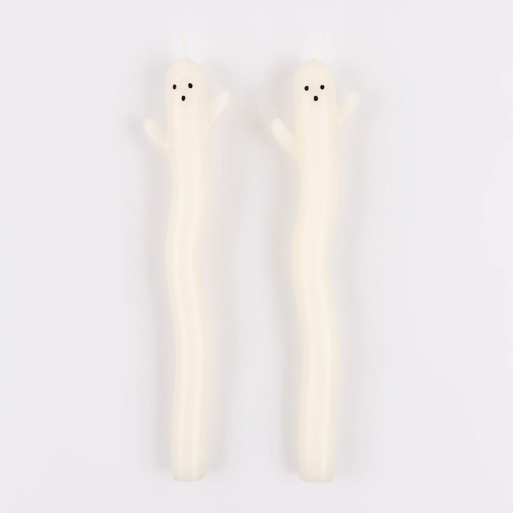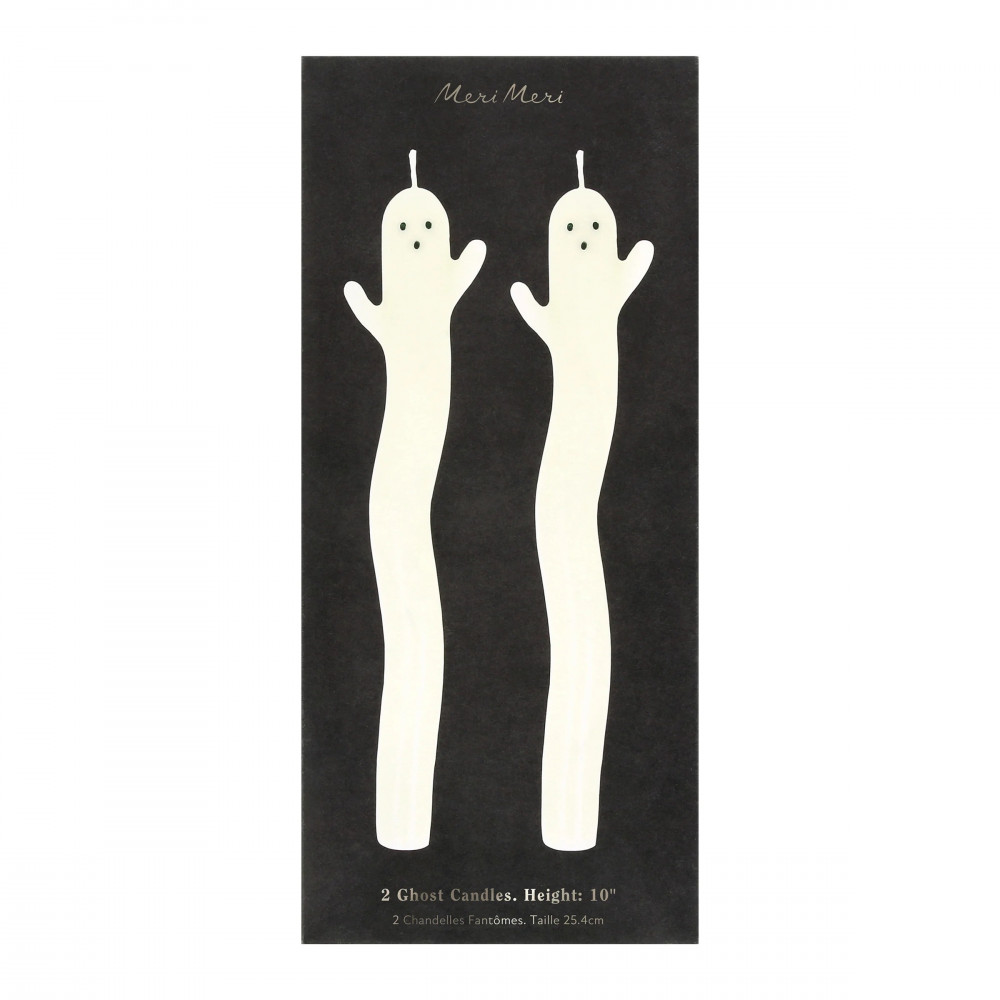 Woooooo! Let these long, wavy ghost candles add an elegantly eerie atmosphere to your party. Place them in your own candlestick holders on the table or mantel for a thrilling effect. If you don't light them, you can use them year after year for an instant Halloween decoration. Great for parties for kids and adults, they also make a fantastic host gift. 2 Ivory molded ghost candles with ivory wicks Ghost face is hand painted in black wax Beautifully presented in a kraft box Burn time approximately 7 hours Pack of 2 Product dimensions: Candle height - 10 inches