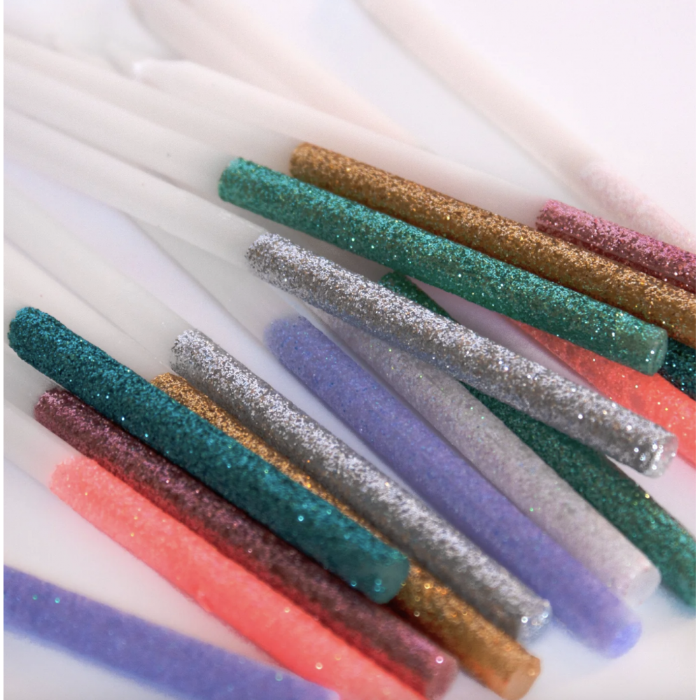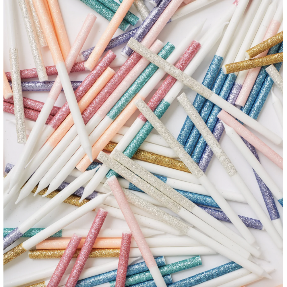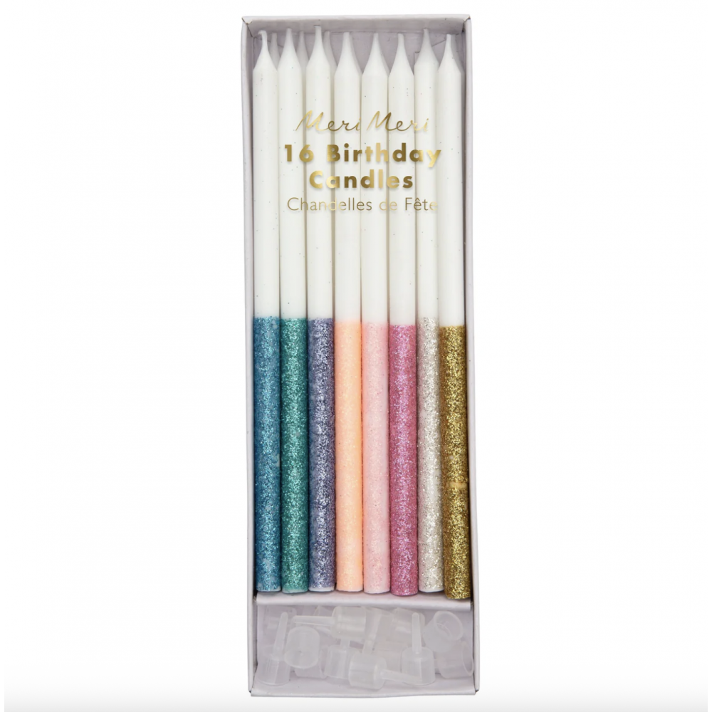 These gorgeous two-tone glittery candles will look really impressive on a special celebration cake, or cupcakes. The colors will perfectly complement any birthday theme. They feature glitter detail They come with plastic holders Pack of 16 in 8 colors Product dimensions: Candle height - 5.75 inches
