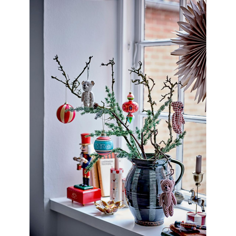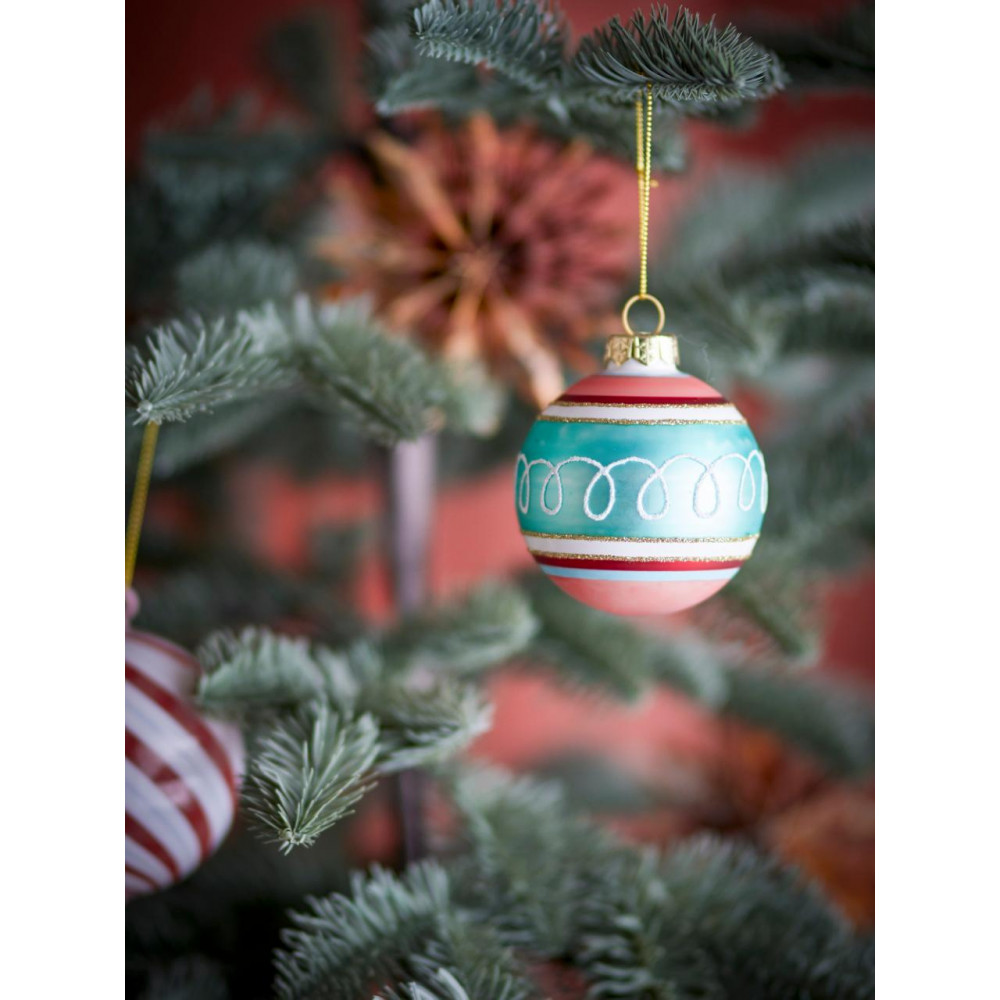 The Kota Ornament by Bloomingville is crafted by glass and hand-painted in blue, red, and golden shades. Hang the Christmas bauble with the golden cord and let it adorn the Christmas tree or the window. The hand-painted details make each ornament unique. D7 cm