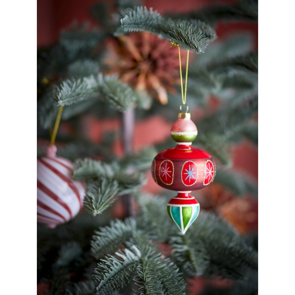 The Kota Ornament by Bloomingville is crafted by glass and hand-painted in red, blue, and green shades. Hang the Christmas bauble with the golden cord and let it adorn the Christmas tree or the window. The hand-painted details make each ornament unique. D7xH13 cm