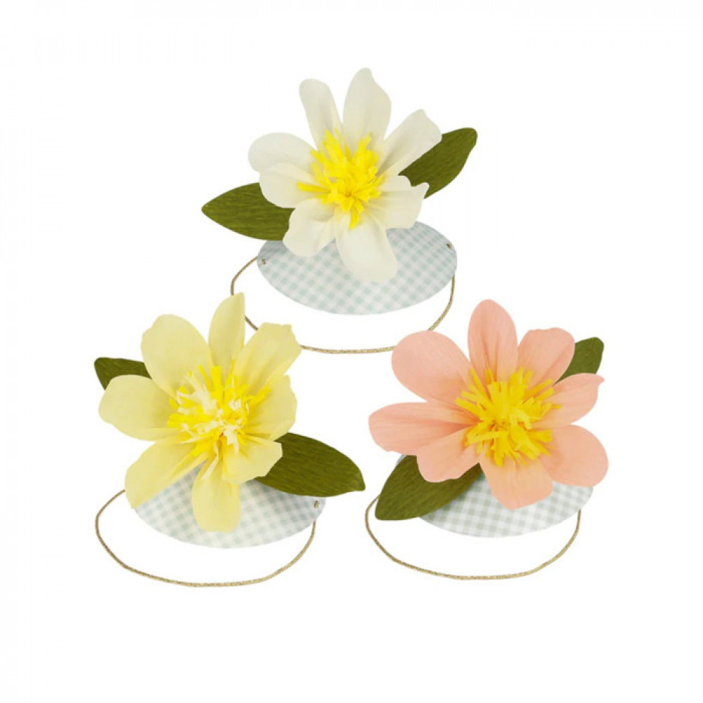 These gorgeous flower party hats are designed to look like stylish fascinators. They are beautifully crafted from crepe paper and on-trend green gingham card. Perfect for your guests to wear at Spring and summer parties, and for imaginative play afterwards too.