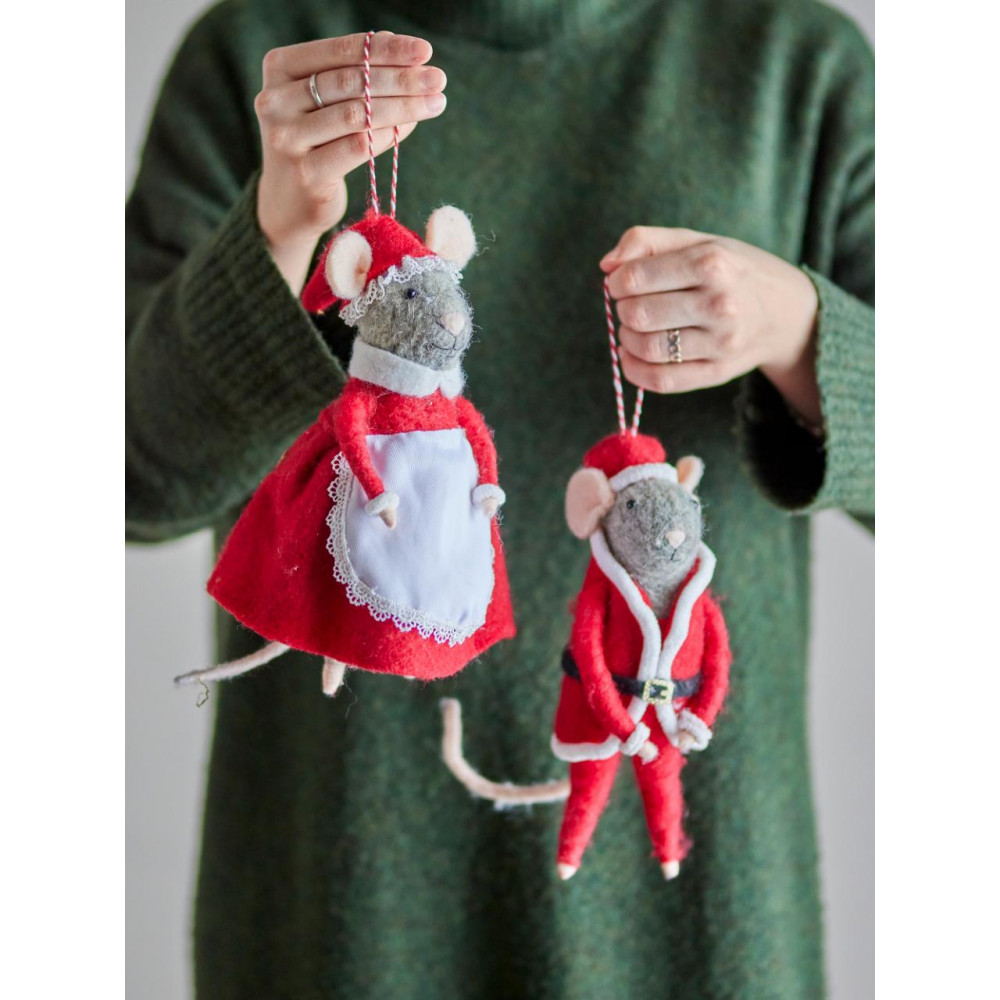 The Peo Ornament by Bloomingville is a festive decoration consisting of two adorable mice, dressed in charming Christmas attire. They are felted in soft wool and exude warmth and coziness, making them a perfect addition to the Christmas decorations. With their fine hanging cords, they can easily be hung on a hook, a decorative branch, or incorporated into a creative and atmospheric arrangement. L11xH23xW10 cm, Set of 2