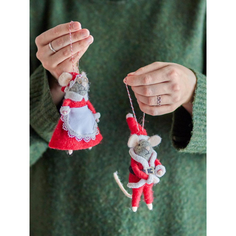 The Peo Ornament by Bloomingville features two felted mice, elegantly dressed in festive Christmas colors and adorned with charming details. Their cheerful expressions add a warm and inviting touch to your holiday decor. Equipped with red and white hanging cords, they’re perfect for the Christmas tree or as part of a decorative arrangement, bringing a delightful charm to any setting. L7xH12xW7 cm, Set of 2