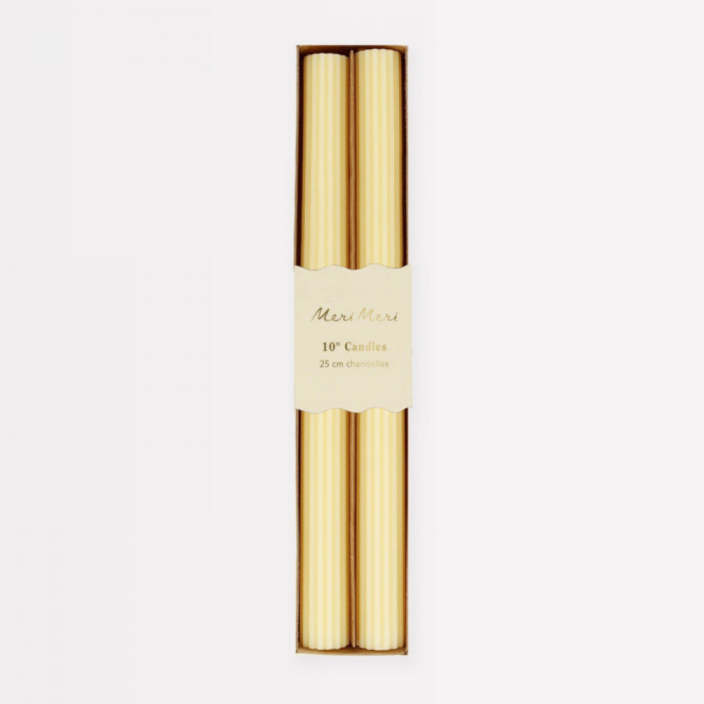 These striking yellow candles have matching wicks with ridged details for an oh-so-stylish look. Use them to decorate your party table or mantel or give as a fabulous hostess gift. 2 Tall ridged wax candles in blue The wicks match the candle colour Packed in a kraft box, with a paper band and no acetate window Burn time is 6 hours Fragrance free Pack of 2 Product dimensions: Candle height - 254mm