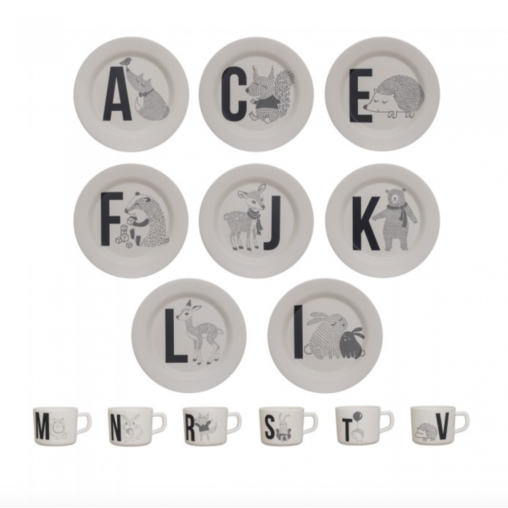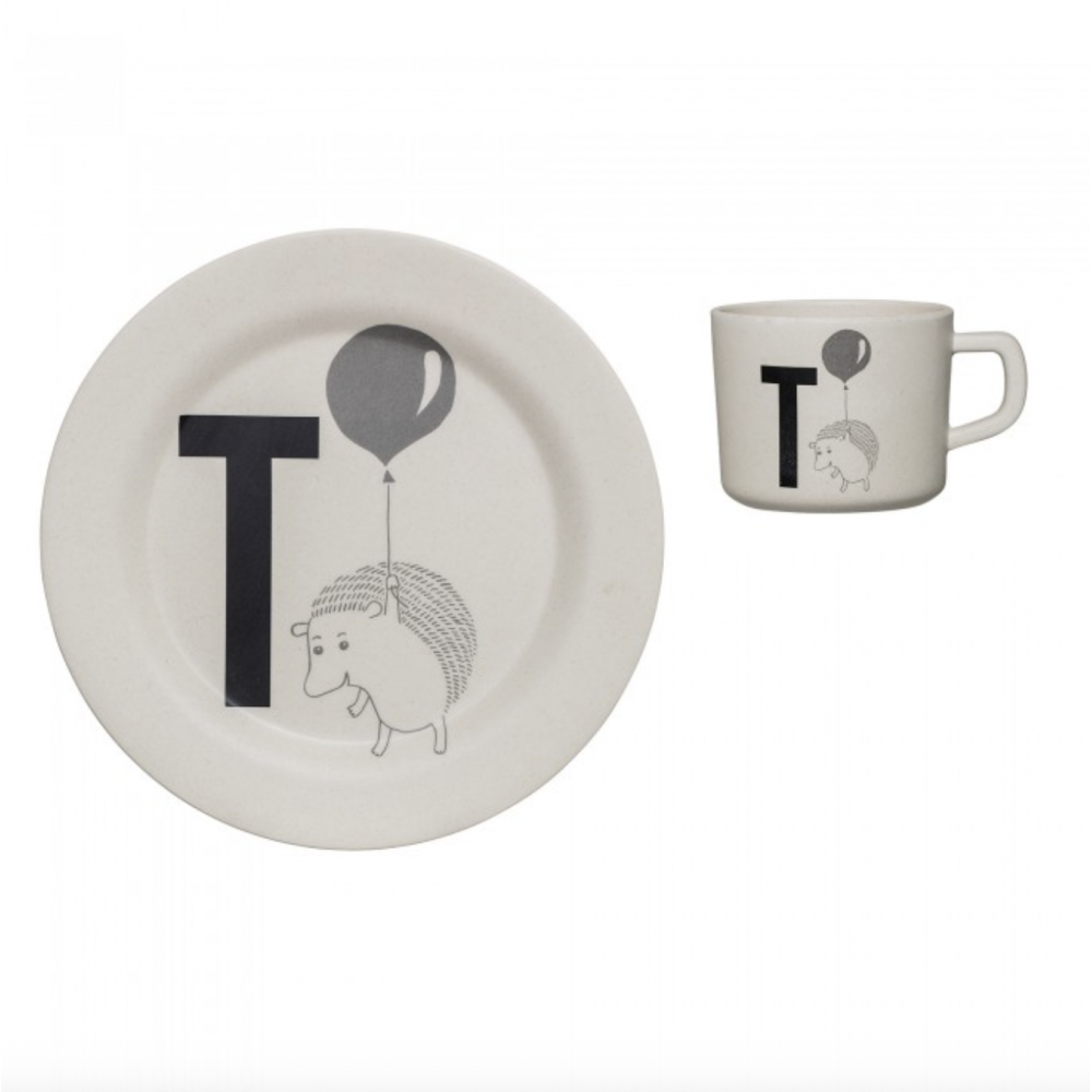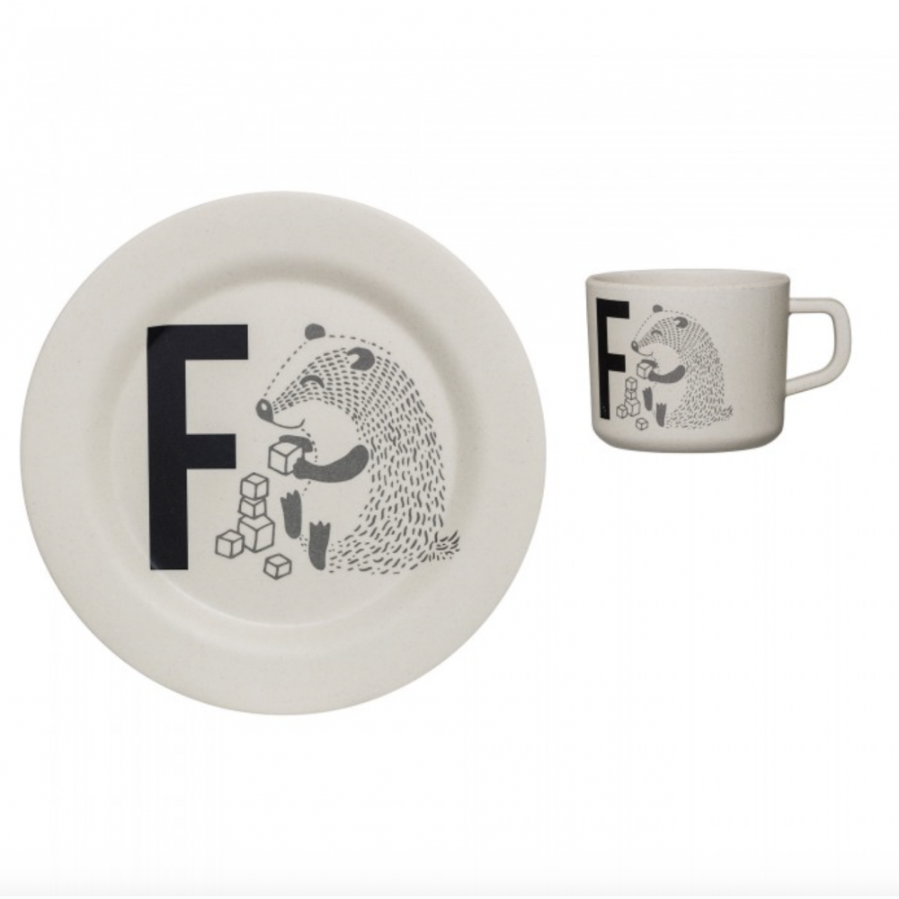 Bamboo cup with handle and flat plate Different print for each letter. Size: 21 cm