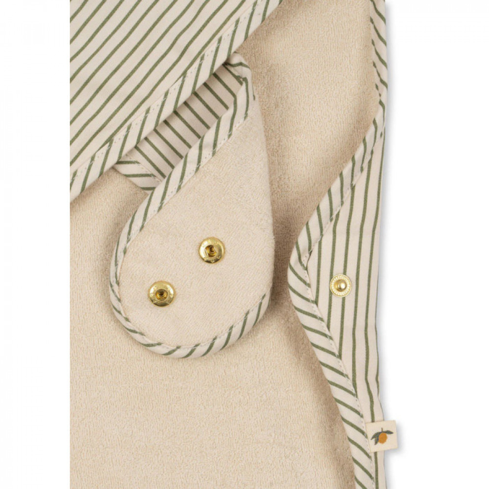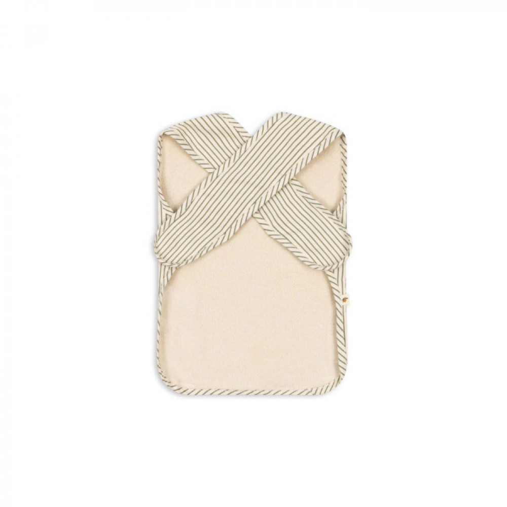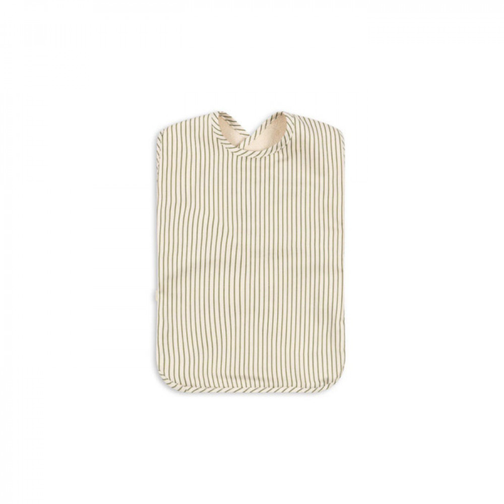 Large bib with a coated front that makes it easy to clean. The bib is made in 100% cotton with BIONIC Eco finish, a breathable fluorine-free impregnation that makes it water-repellent.