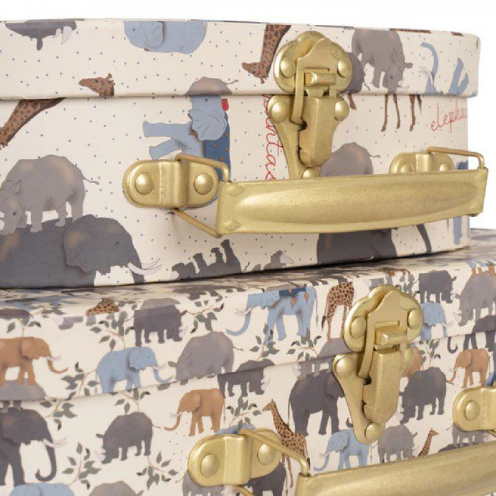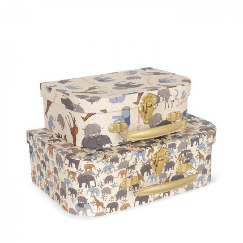 Set of two cardboard play suitcases made with a metal handle. The smaller suitcase fits into the larger one. Set of two cardboard play suitcases made with a metal handle. The smaller suitcase fits into the larger one. Big: 25.5 x 17 x 8.5cm Small: 20 x 14 x 7 cm
