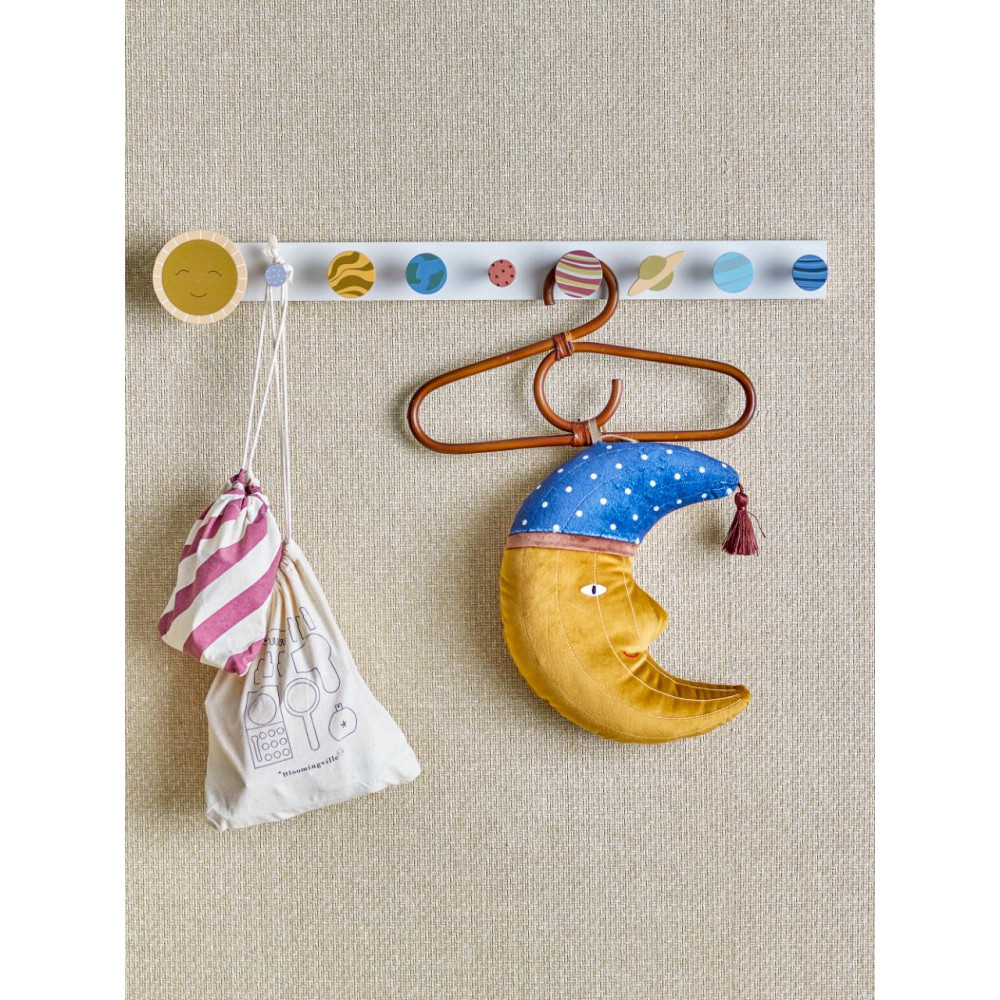 The Aranya Hanger by Bloomingville MINI is handcrafted from natural rattan. The hanger features fine details and can be used in the children's room for clothes on a clothes rack or in the hallway for hanging jackets, scarves, or other accessories. Due to the natural material, there may be variations in color. L30xH17 cm