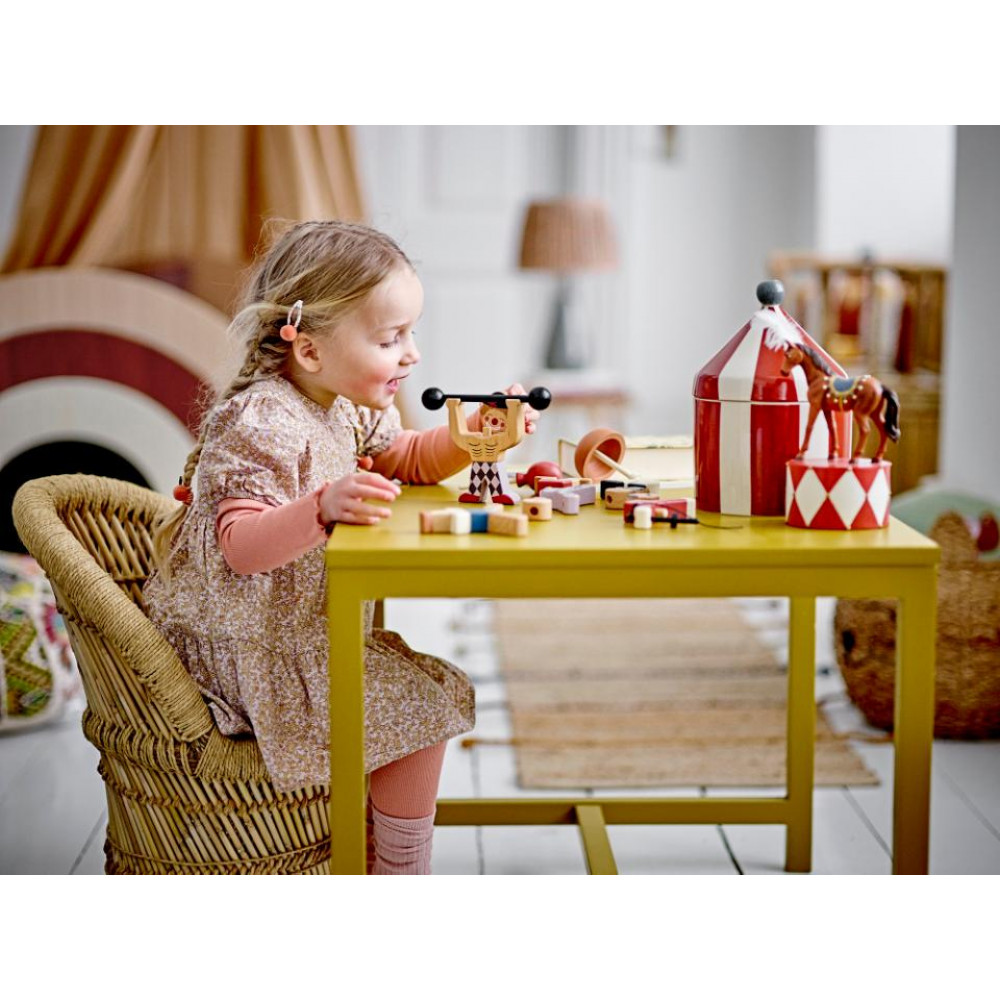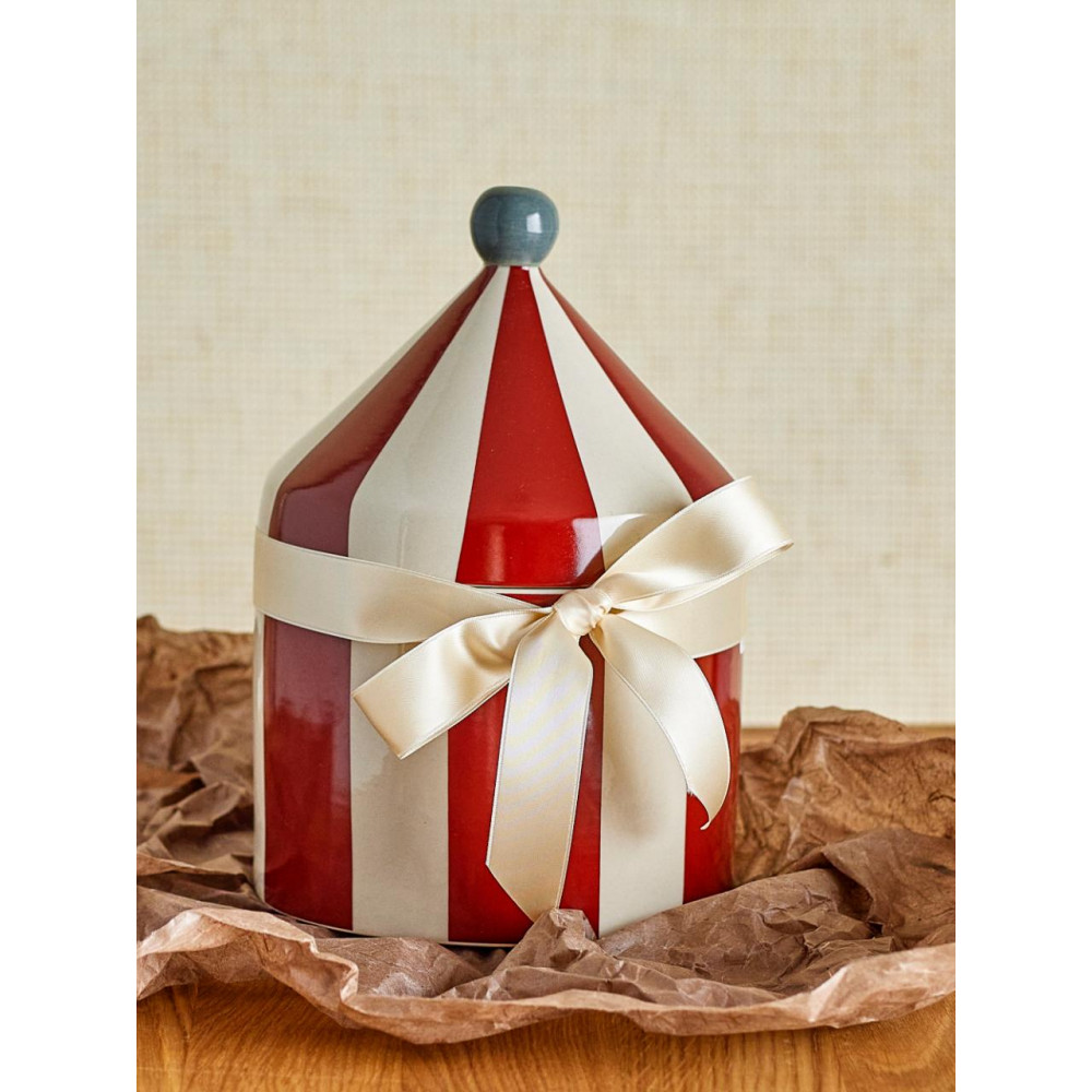 Introducing the Cimmi Jar with Lid from Bloomingville MINI – a delightful storage solution that infuses playfulness and imagination into any child's space. This cute jar is shaped like a circus tent and made from stoneware with a striped pattern of red and white. It's perfect for keeping little treasures safe, from candies to tiny toys, and also serves as a decorative element in the children's room. D15,5xH26 cm 1.150 ml
