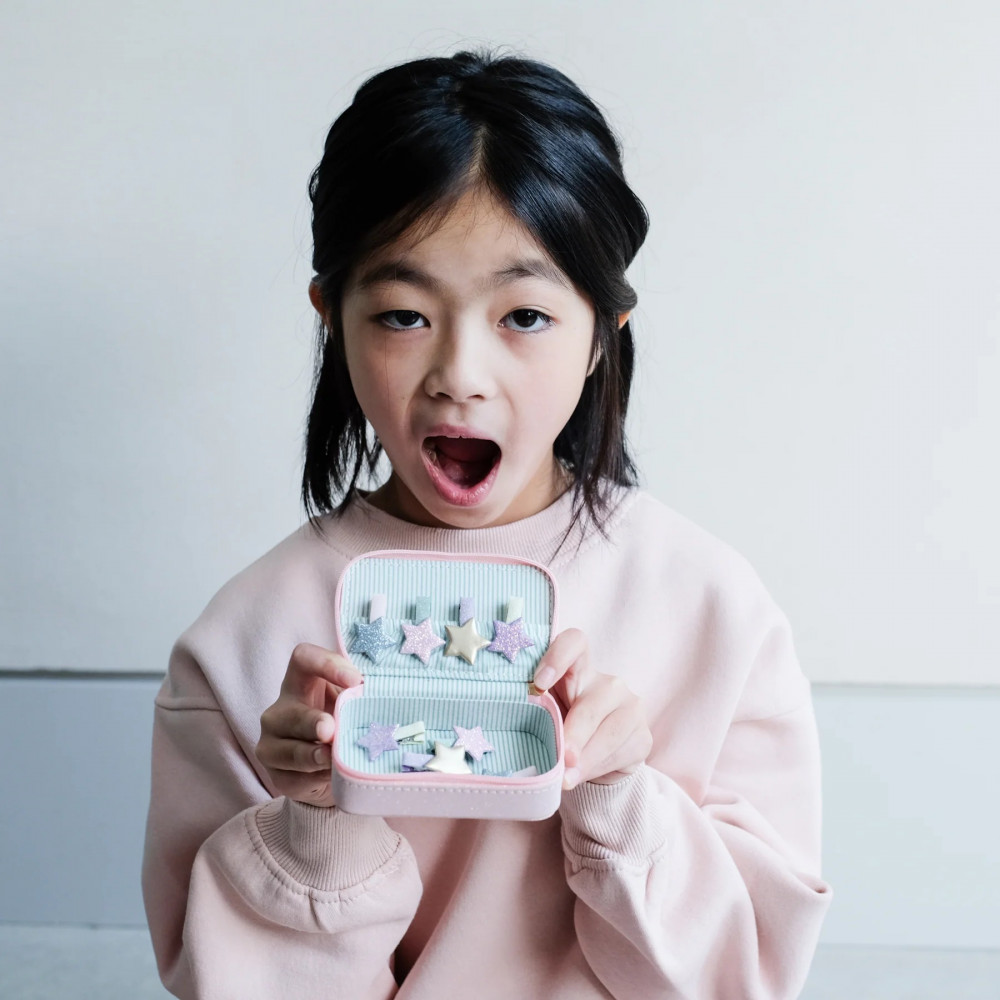 Meet our new Mini jewellery box! In gorgeous metallic gold, it's the perfect shiny little storage space for all those important bits and bobs! Ideal for jewellery, mini clips or ponies alike and great for taking their treasures on the go! Crafted from soft metallic gold fabric with bright pink candy stripe stripe lining featuring an elasticated storage pouch to the lid Measures approx W 10cm x D 6cm x H 3.5cm Wipe clean only Warning! Not suitable for children under 36 months